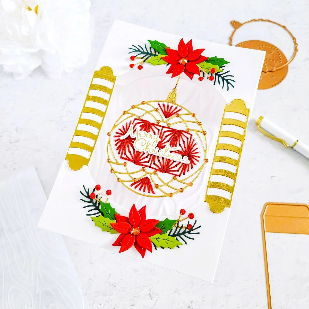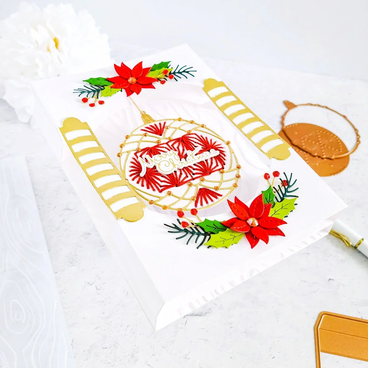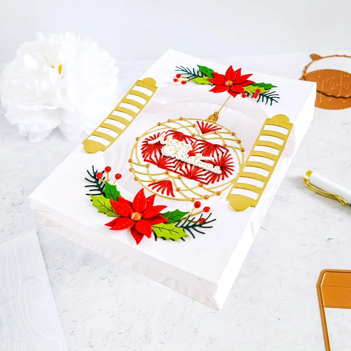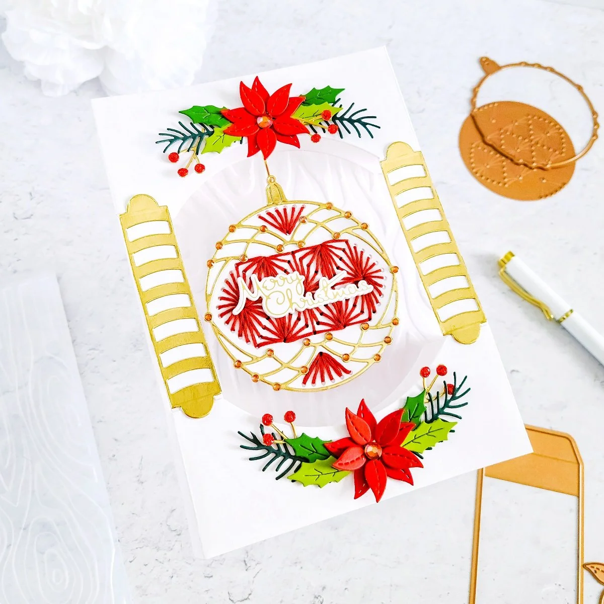 From there, after getting the ornament embellished, I also went ahead to add a little interaction effect to the card by pierce a small whole in the center of the upper dimensional effect using the pierce tip from the Tool ‘n One. Then, I used a small paper fastener to attach and secure the die-cutting string for the ornament. By doing that step, I was able to add a little interaction as, the ornament can swing from side to side. This is another unnecessary step however, is always fun to add a little extra effect to your cards, isn’t it!?