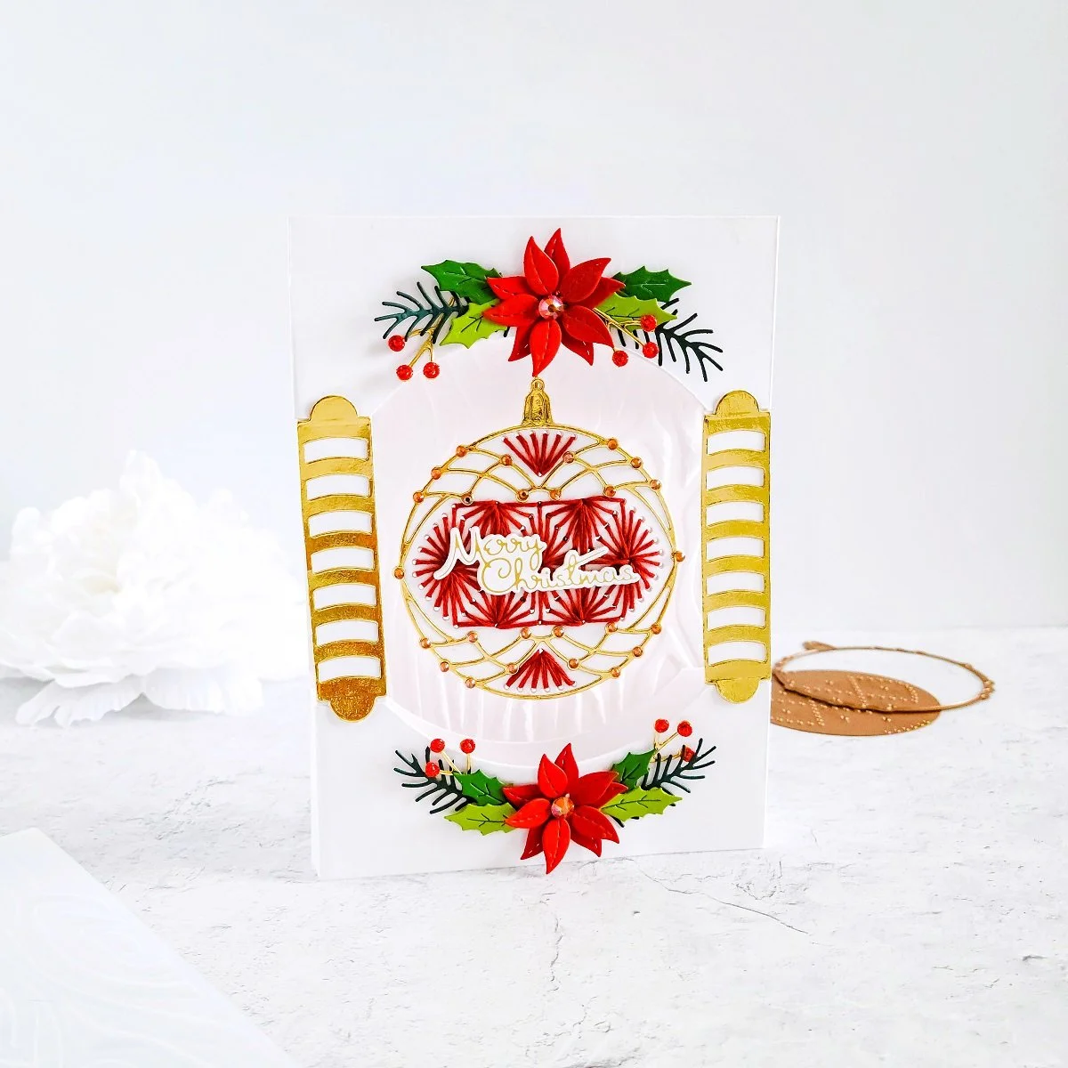 Then, after getting the ornament’s string into place, I went ahead to glue down he ornament but making sure I had it gluing down right in the center of the card opening window just like, you can see it in the image above. And right after that, I proceeded to get the smaller holiday bloom clusters mounted in the upper and lower center of the card.