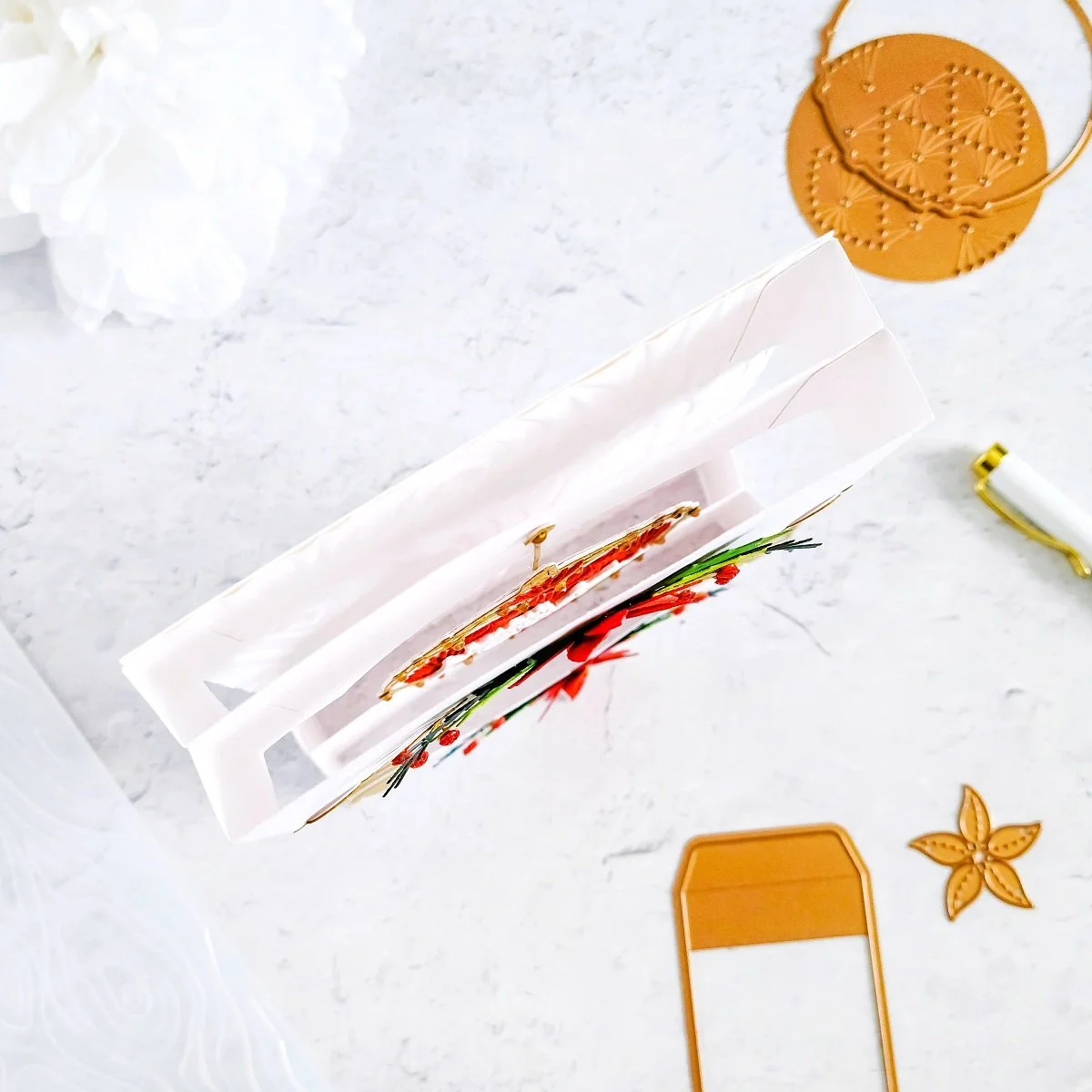 Therefore, to create the shadow box effect first, I went ahead to create the base so, to do that, I went ahead to cut from white cardstock four equal die-cutting pieces for the upper and lower parts of the card base using, one of the dies included in the club along with the Platinum 6 Die Cutting and Embossing Machine. Next, I used the insert die to cut out the rounded parts for the die-cutting pieces and then, I proceeded to fold over each of the scoring lines on each side from die-cutting pieces. By the way, the die also add those scoring lines at the same time that does the die-cutting process.