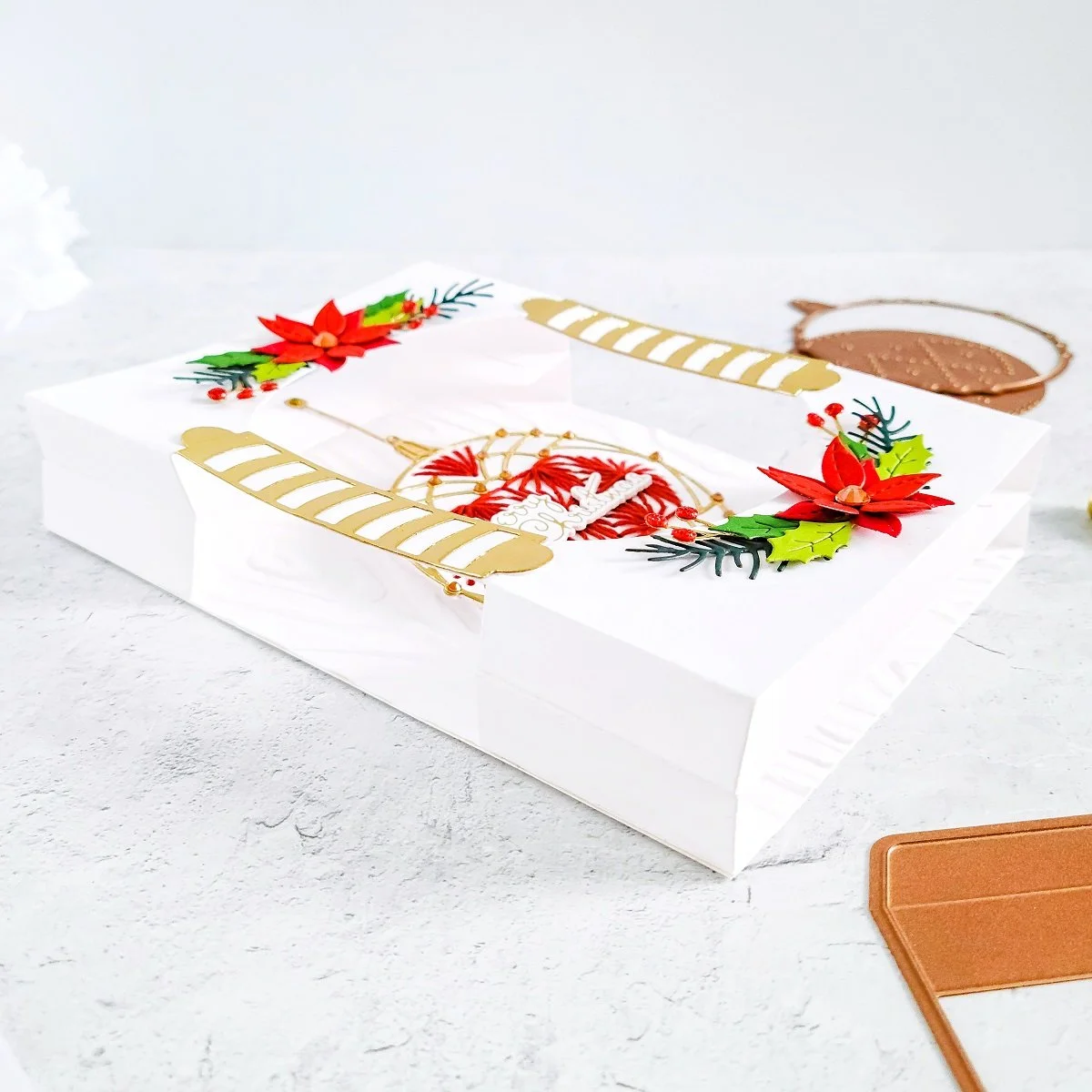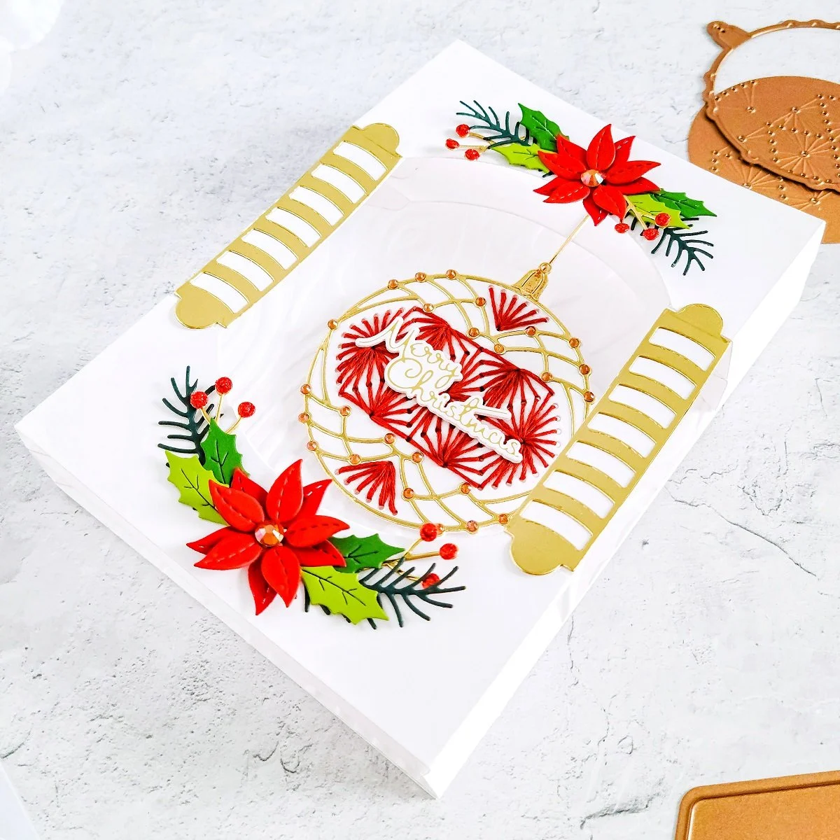 Lastly, to finish this dimensional project off, I went ahead to add the Merry Christmas greeting in the center of the ornament and then, to add more stability to the shadow box looking card, I got the backing of it adhered to another white card panel but this time, I used heavy weight cardstock. By the way before I forget, I would like to mention that this is a 5x7 inches with 2 inches in width size project. Also, in case you wonder, for the card sentiment, I used one of the sentiments included in this month’s Clear Stamp & Die of the Month Club.