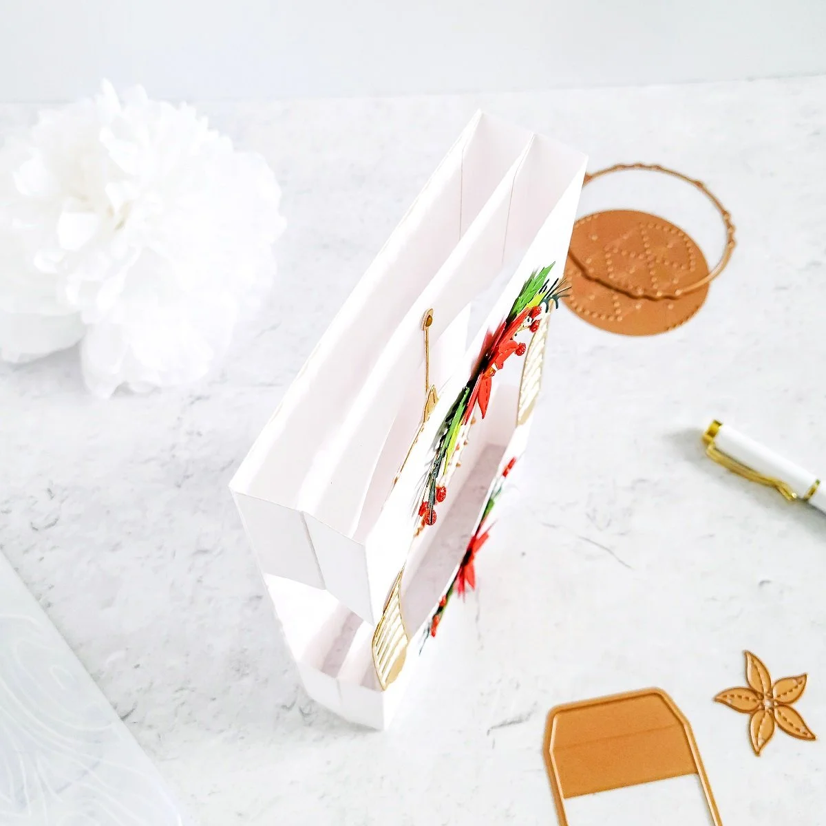 Thus, after getting the die-cutting and scoring process completed for the die-cutting pieces, I went ahead to put them off aside to proceeded with the die-cutting for the poinsettias and greenery. Plus, the die-cutting steps for the stitching ornament and the rest of its embellishment pieces.