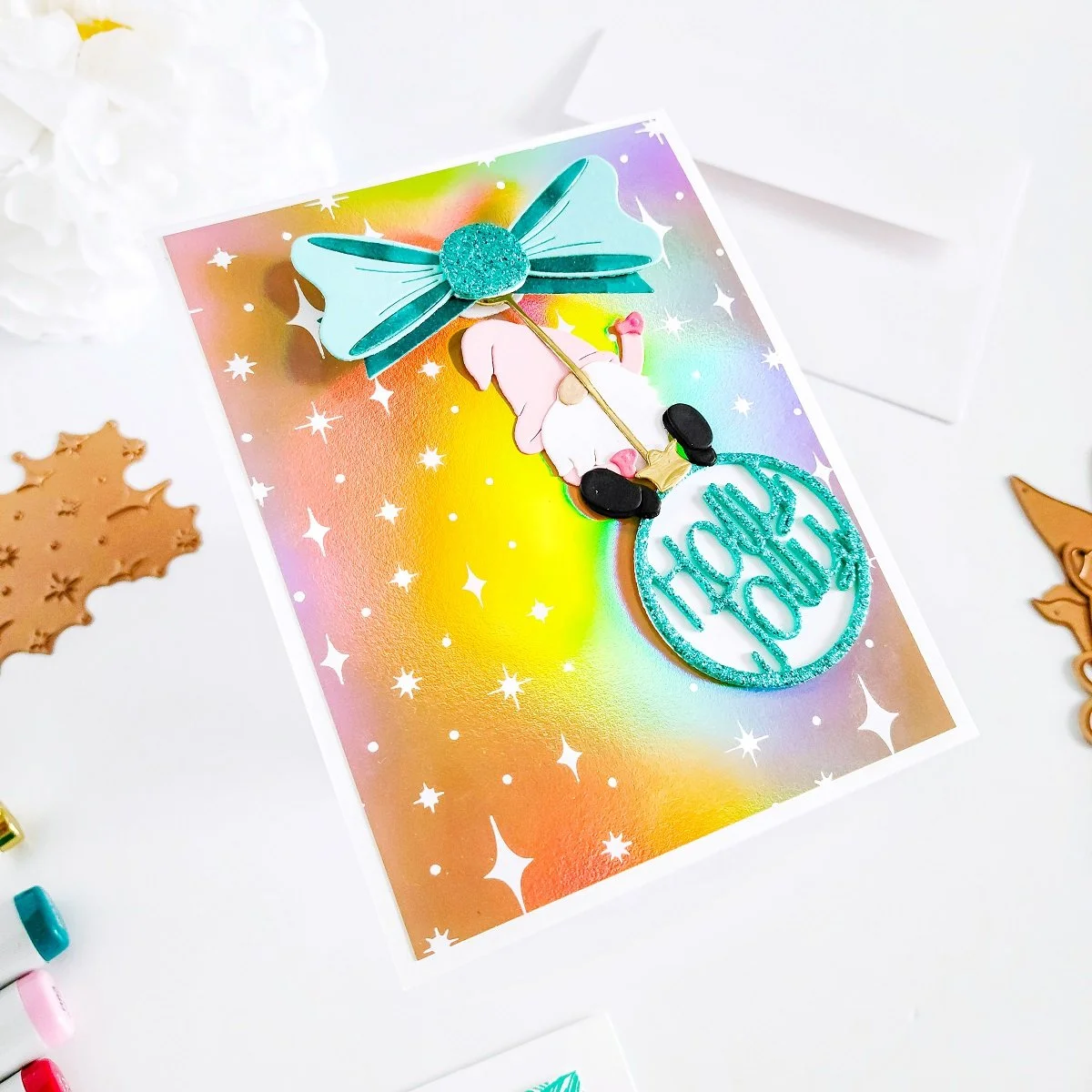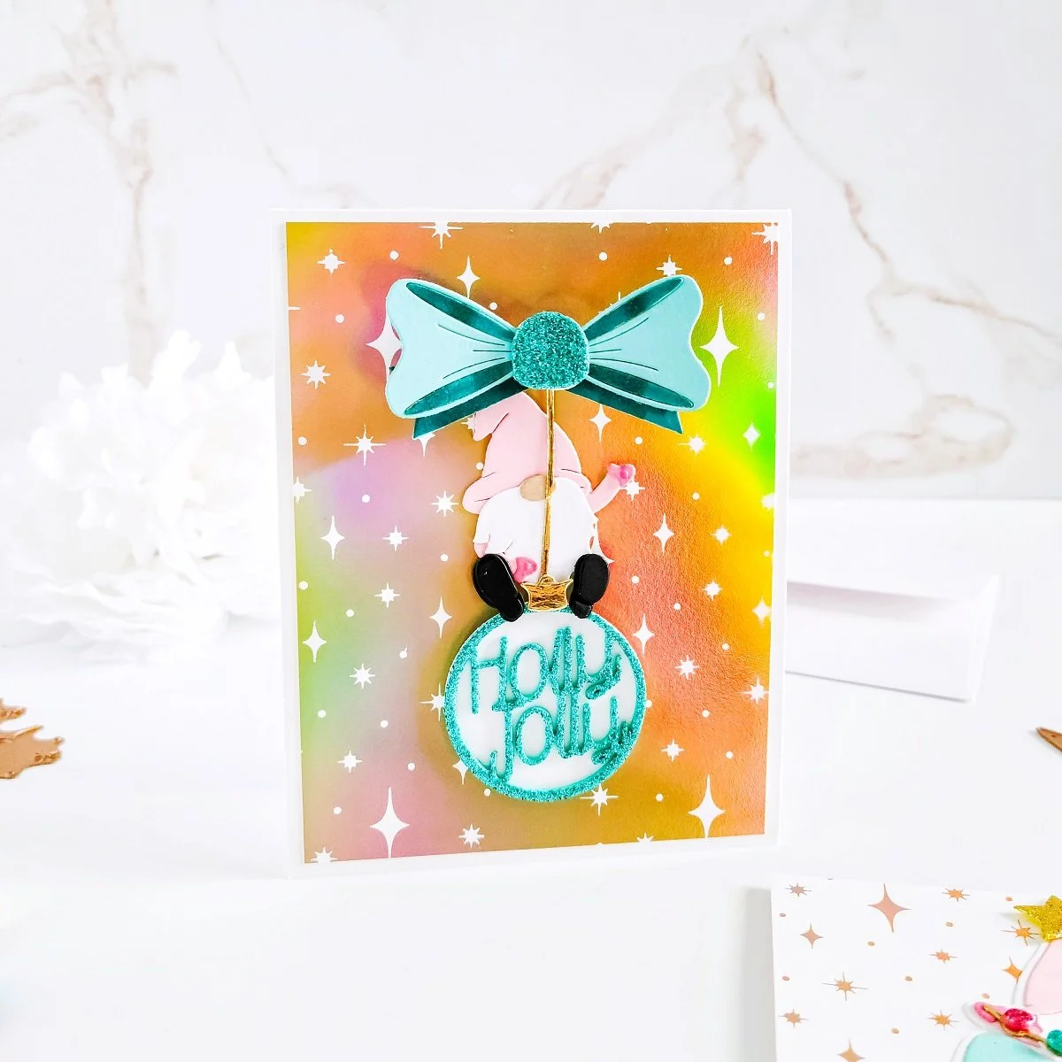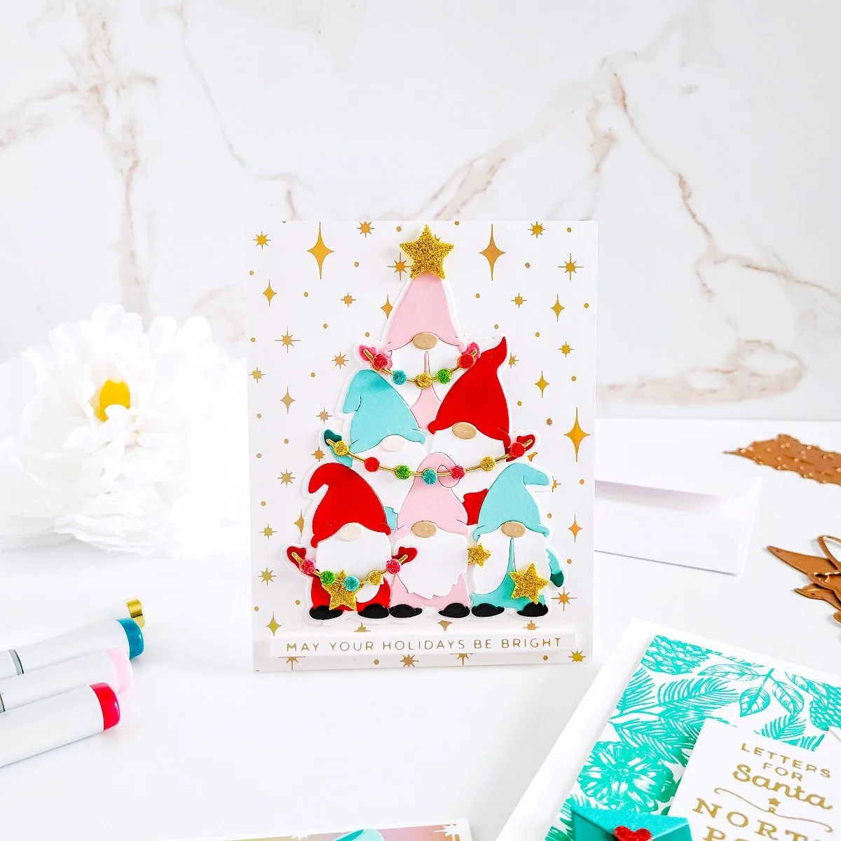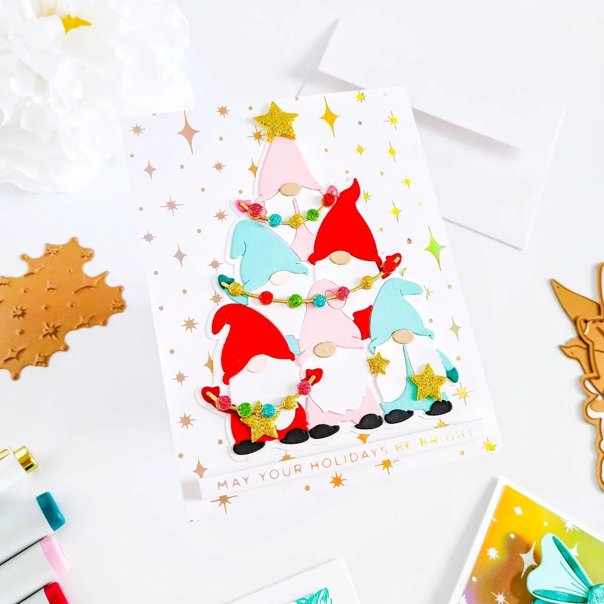 Moving on, after getting the gnome tree assembled, I went ahead to get the backing of it gluing down to the card base and then, I got the gnome tree embellished with the glittery die-cutting ornaments, ornament strings, and stars; die-cutting pieces which, I had previously die cut using the smaller dies included in the set along with a combination of Pop-Up Die Cutting Glitter Foam Sheets- Shimmering Tropics, Pop-Up Die Cutting Glitter Foam Sheets- Peony Pinks, Pop-Up Die Cutting Glitter Foam Sheets - Red & Green, and Pop-Up Die Cutting Glitter Foam Sheets - Gold & Silver to add them a touch of shine. Finally, after I had gotten the gnome tree embellished with the sparkling die-cutting pieces, I proceeded to finish the card off by getting a hot foil stamped sentiment mounted under the gnome tree just like, you see it in the image above. By the way, I used one of the glimmer plates from Glitter Wishes Glimmer Hot Foil Plate & Die Set for the card sentiment.