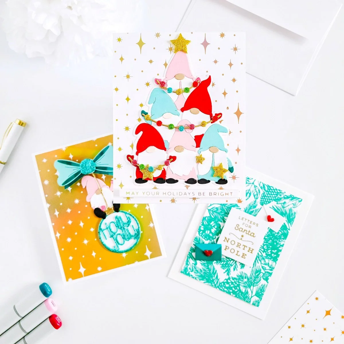 Happy Saturday, Friends! On today’s blog, I’d like to share with you a holiday season’s set of inspiration cards with a “Gnomie & Glimmering” look to showcase, the latest Gnome for Christmas Collection by Spellbinders. Which includes: Gnome Tree Etched Dies, Holly Jolly Gnome Etched Dies, Twilight Sparkle Strip Glimmer Hot Foil Plate, and Pretty Pine Background Clear Stamp Set. Besides that, I used Glimmer Hot Foil Roll: Aura, Glimmer Hot Foil System Platform, and Platinum 6 Die Cutting and Embossing Machine for the hot foil stamping look. So, without further ado let’s jump right in to the step-by-step for how I made them ↓