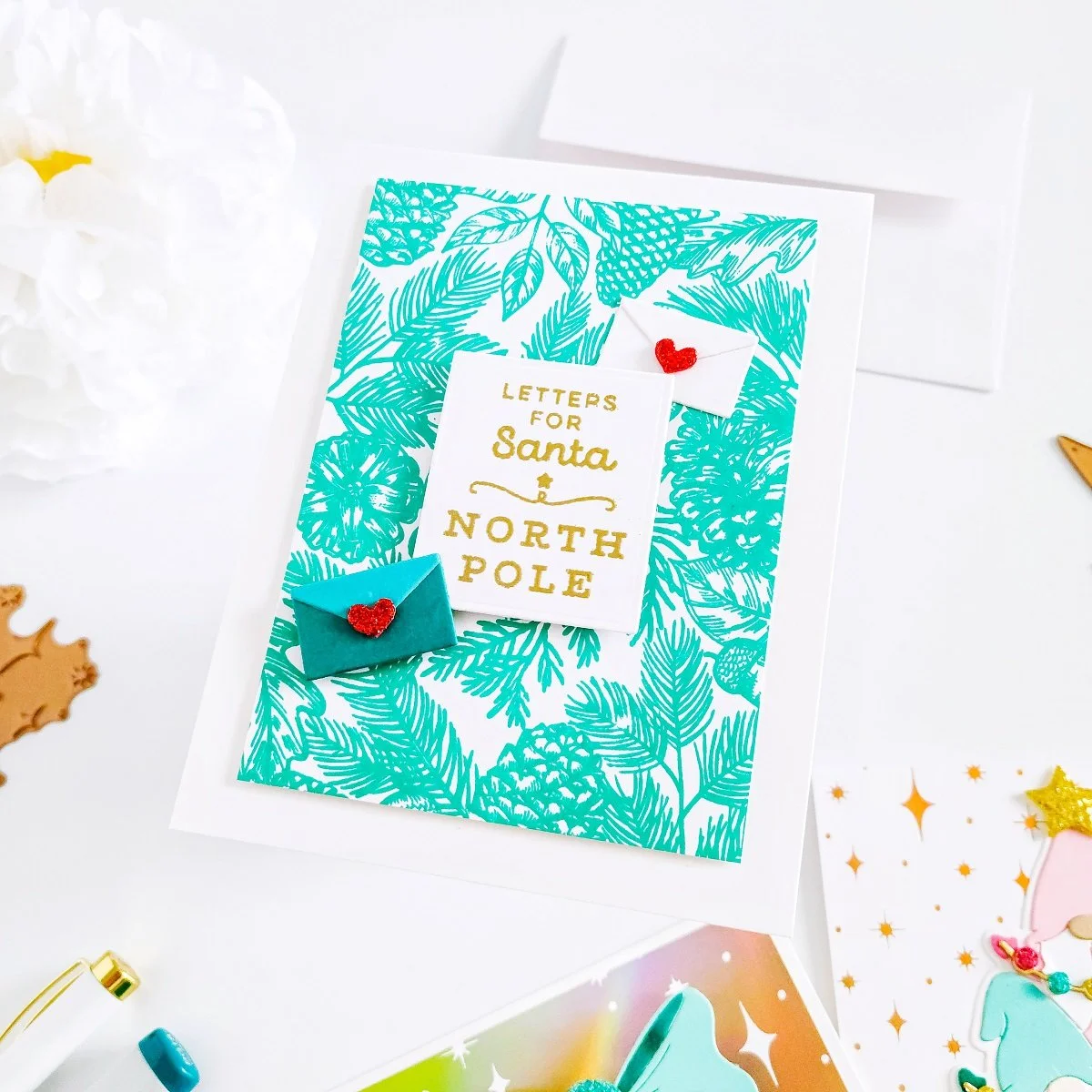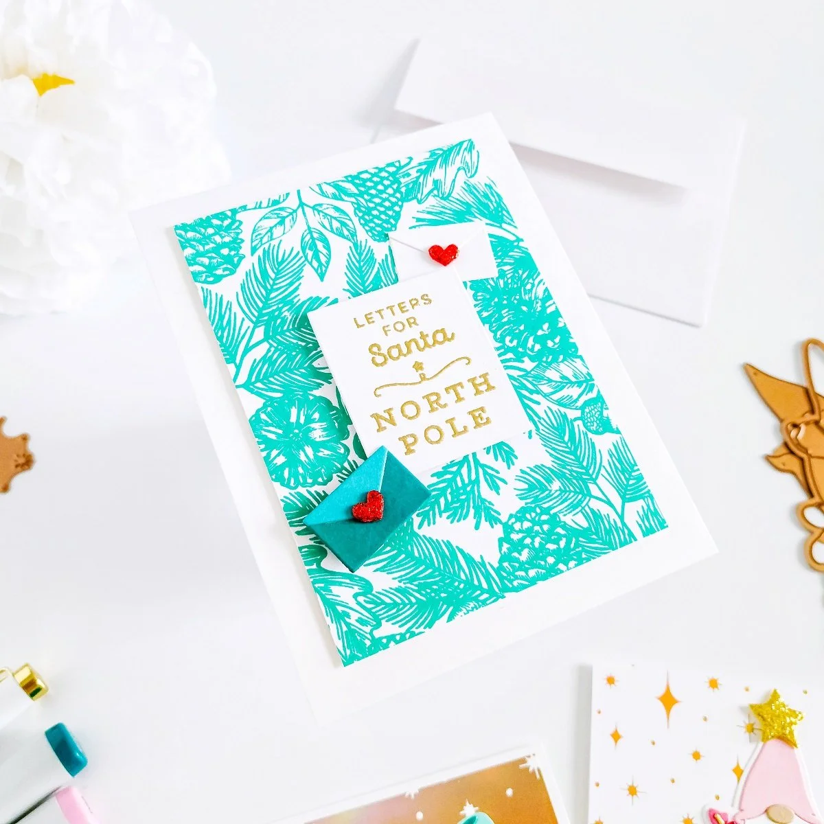 Once, I had the front card panel adhered to the card base, I finish the card off by getting it embellished using a heat embossing sentiment and by gluing down two mini envelopes. By the way, I used embellishing elements from previous projects on which I used Parcel & Post Mailbox Etched Dies and Parcel & Post Sentiments Clear Stamp Set to make them.