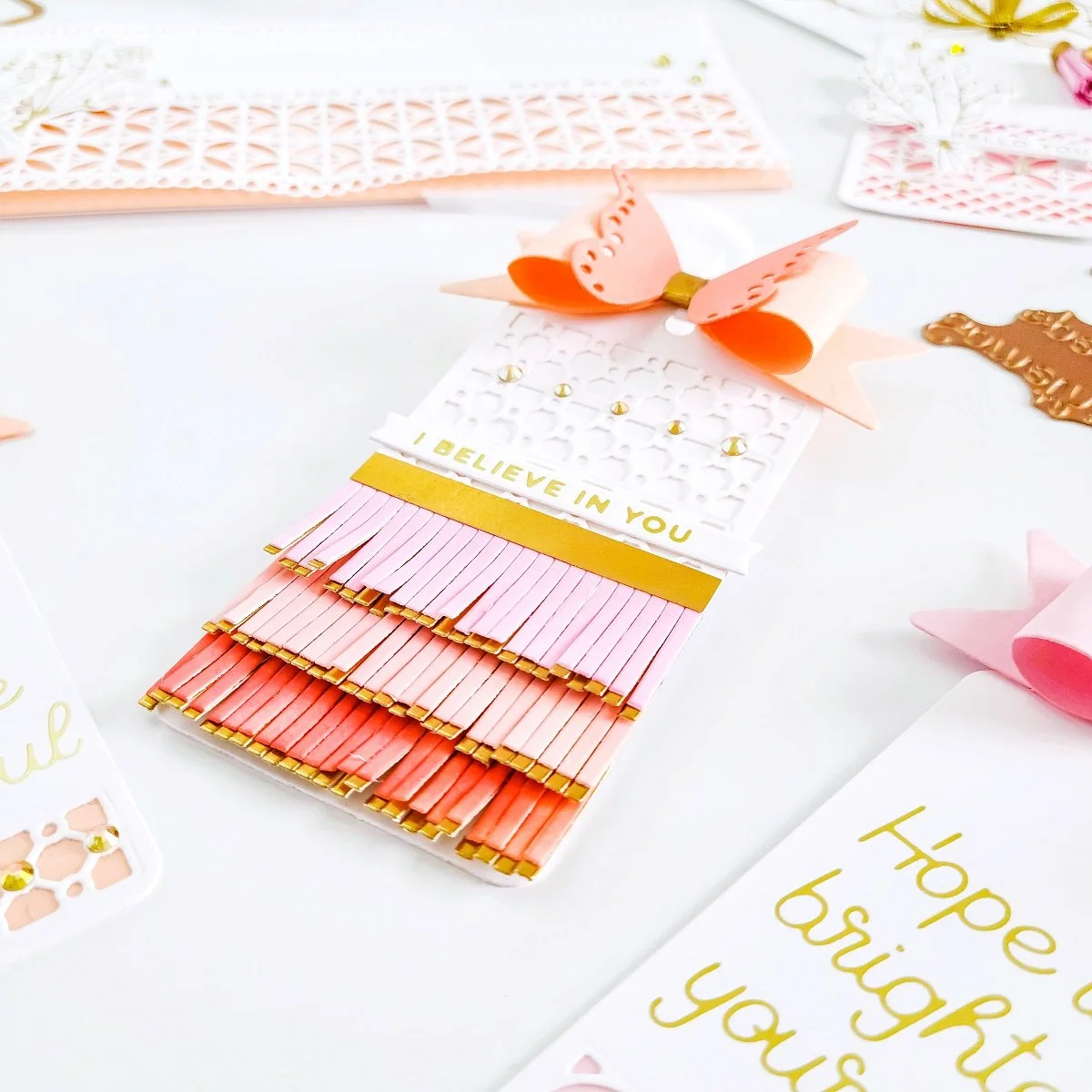 Then, to add an extra decorative touch to this tag, I used the die that included in the tag set that adds up the die-cutting fringe effect. So, to create the effect, I went ahead to cut out the fringe piece three times out of white cardstock and another three times from gold foil cardstock to create the layered effect. Then, I added pops of colors to the white die-cutting pieces using the same hues that I used in the first example. Lastly, after adding the pops of colors, I had gotten them layered over and then, I went ahead to get them glue down to the lower part of the tag. And, to finish this tag off, I went ahead to use another of the hot foil sentiments created using one of the glimmer plate sentiment from Mini Sincere Sentiments Glimmer Hot Foil Plate & Die Set. By the way, I’d like to mention that I used this same fringe die to create the tassels in the first example.