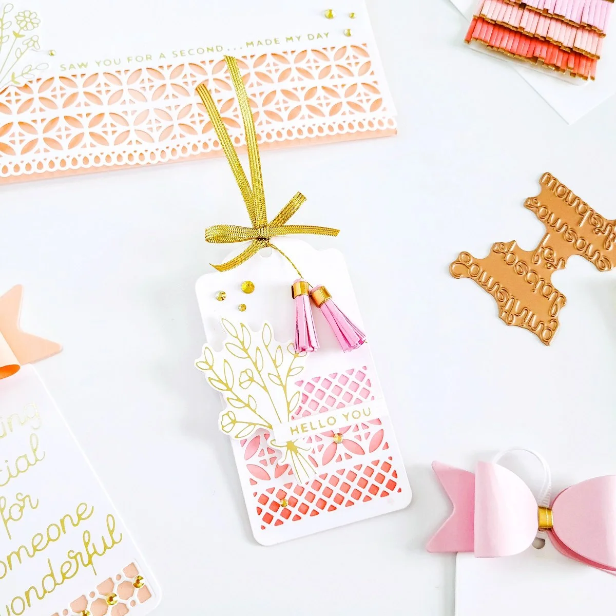 Having that being said, I went ahead to get the tag embellished using a die-cutting bow created out of Pink and Gold Foil cardstocks using the dies included in Create a Flutter & Flower Bow Etched Dies. Then, a piece of narrow white ribbon and the tag sentiment which, I had gotten previously hot foil stamped using one of the glimmer plates included in Something Special Glimmer Hot Foil Plate and the same foil color.