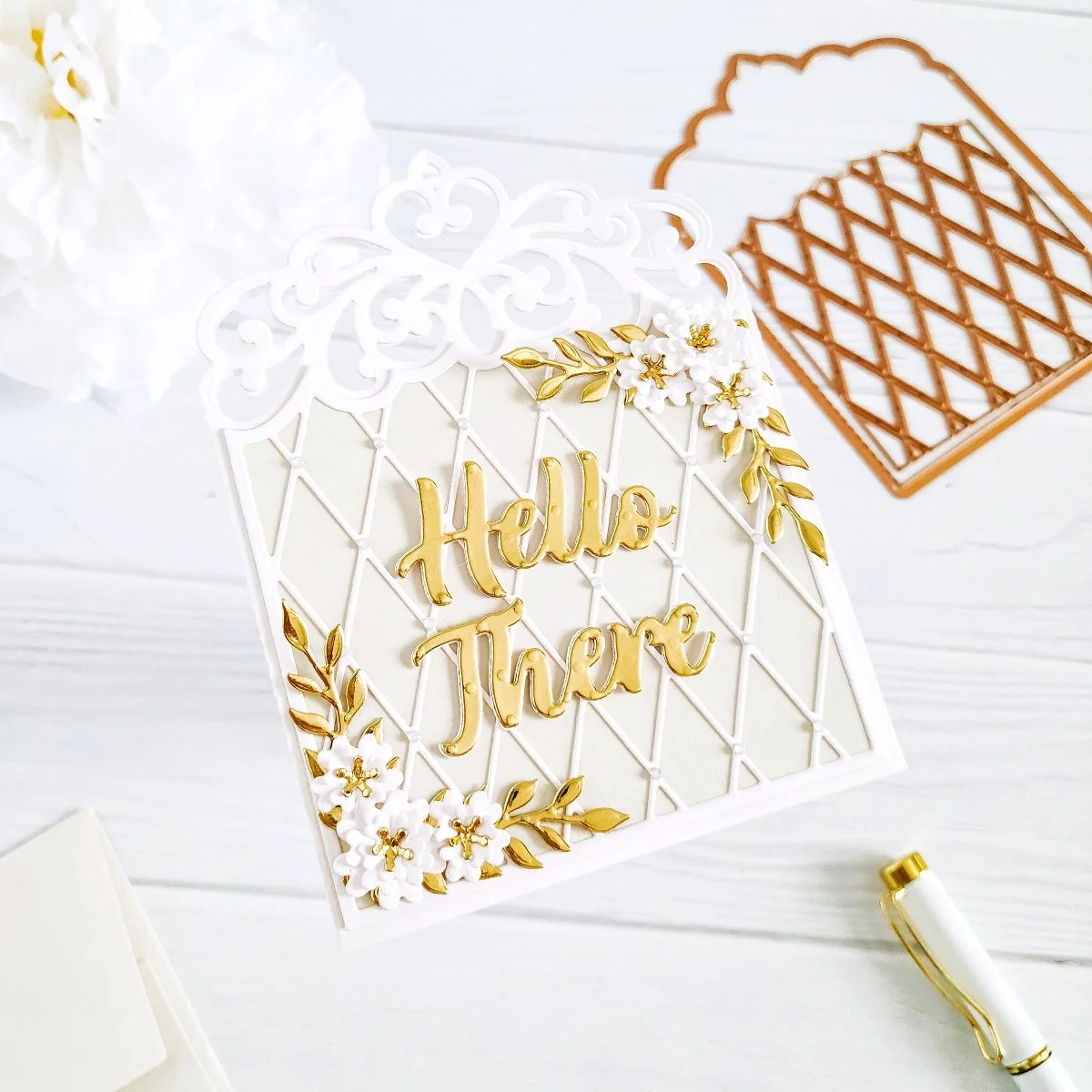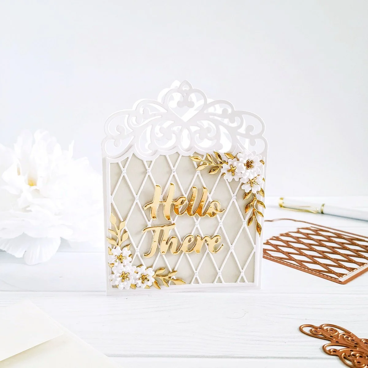 Next, right after I had the card base folded, I went ahead to add the decorative die-cutting steps to it so, to do that first, I went ahead to use the insert die the adds up the decorative tiara die-cutting design to the top of the card base. Second, I used the outlined insert die to cut out the solid decorative piece for the bottom part of the card base by the way, I used light gray colored cardstock for this step. Lastly, I used the outlined die once again but this time, I added the insert lattice die as well to, cut out 3X from white cardstock the decorative bottom piece for the card base.