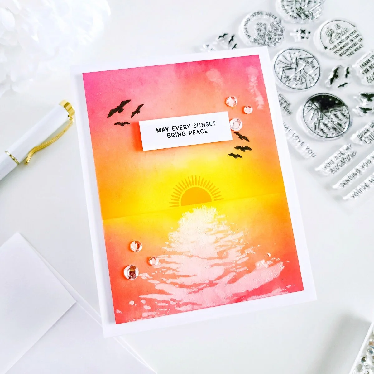 Moving on, right after I had finished the ink blending for the sky and reflection over the card panel, I went ahead to place it inside my MISTI Stamping Tool to get the partial sun stamp image from Clear Stamp of the Month Club stamped twice (as shown in the image above) using a combination of Marigold Ink and Clementine Ink. Next, I added refection to the sea foam using, a sponge and white acrylic paint. And, right after I had finished that step, I went ahead to trim off the edges from it to H 5.0’’ x W 3-3/4’’ inches and then, I’ve gotten the backing of the card panel adhere down using a piece of craft foam and double-sided tape to an A2 top folding white card base to add dimension. Lastly, I’ve gotten stamped one of the sentiments from the stamp set over a piece of white cardstock with Detail Black Ink and then, I mounted it over the card using square foam adhesives to add dimension. Last but not least to finish the card off, I went ahead to stamp 2 bird silhouette groups on each side of the sentiment using the stamp images from the set and black ink as well.