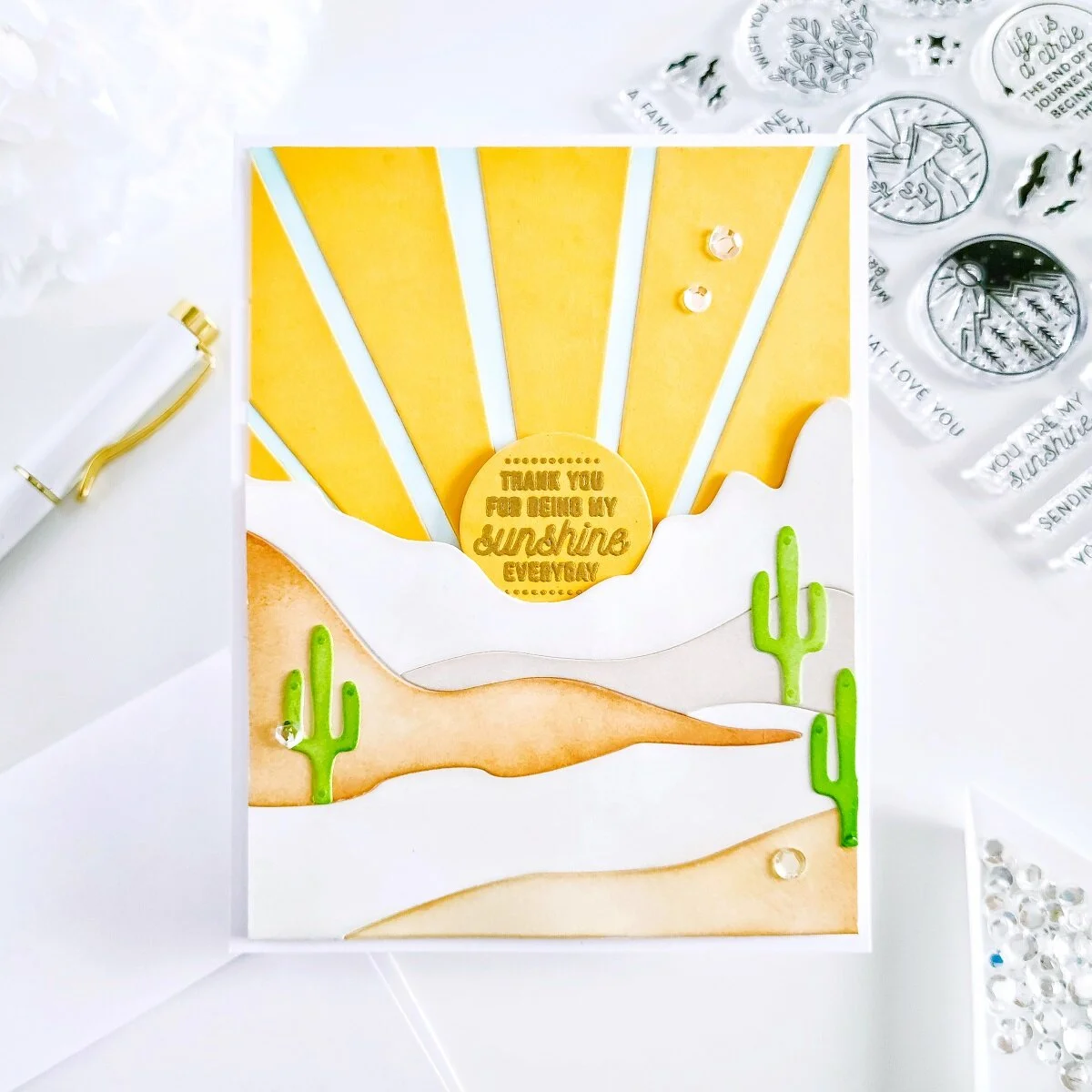 Lastly, for the card sentiment, I stamped, and I also gold heat emboss one of the sentiments from the stamp set over a yellow die-cutting circle. And, then I’ve gotten it mounted over with craft foam adhesive to the card panel to finishing the sunny sky. Then, I went ahead to glue down some cactus which I’ve had previously created using the cactus die including along with white cardstock and Cactus Ink. Last but not least, to finish the card off I went ahead to mount the card panel with craft foam and double-sided tape to add dimension over an A2 size top folding white card base.