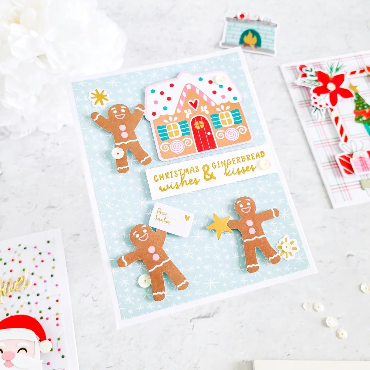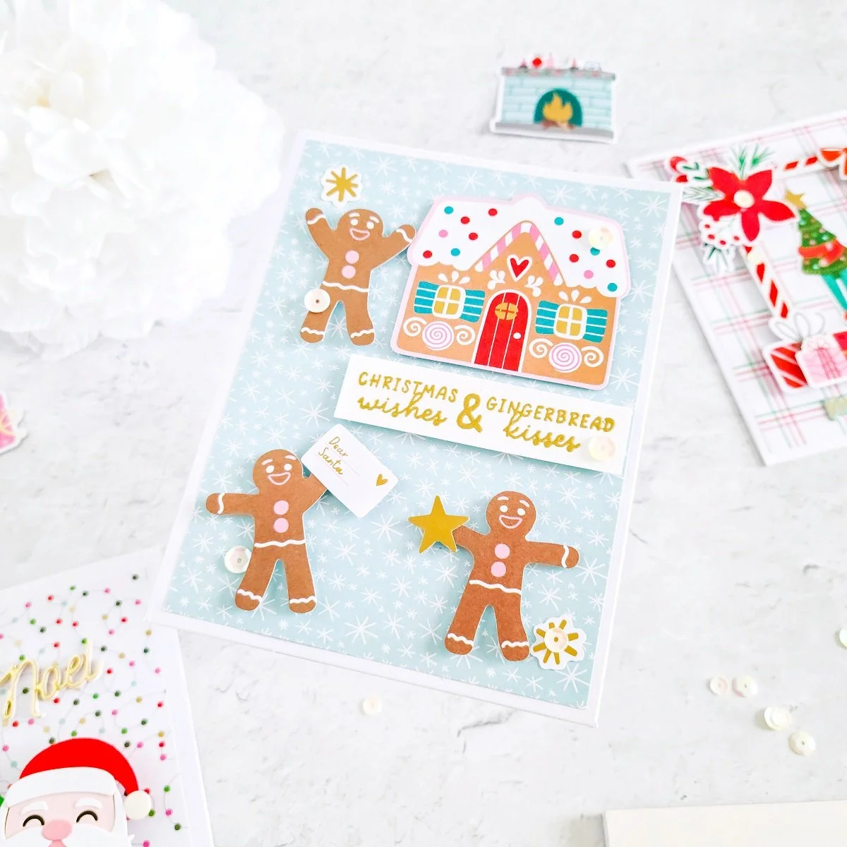 Lastly, for the card example, I went ahead to make a sweet card design with a Gingerbread look so, to do that, I went ahead to trim down a patterned paper sheet a little smaller than the card base and then, I got the backing of it adhered to one of the textured card bases. Then, I proceeded to select the gingerbread die cut shapes along with the gingerbread house to get the card front panel embellished with them.