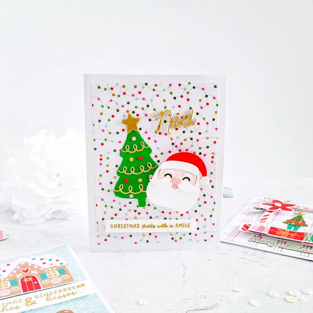 Next, after getting the die-cutting step completed, I proceeded to get the Santa and the Christmas Tree assembled and, once I had that done, I quickly move on to put them off aside to get the Noel sentiment cut out from Gold cardstock using the die included in the kit as well. Then, I added dimension to the Noel sentiment by layering some plain white die-cutting sentiments underneath the gold one and, as soon as, I had that step completed, I got the card assembling started.
