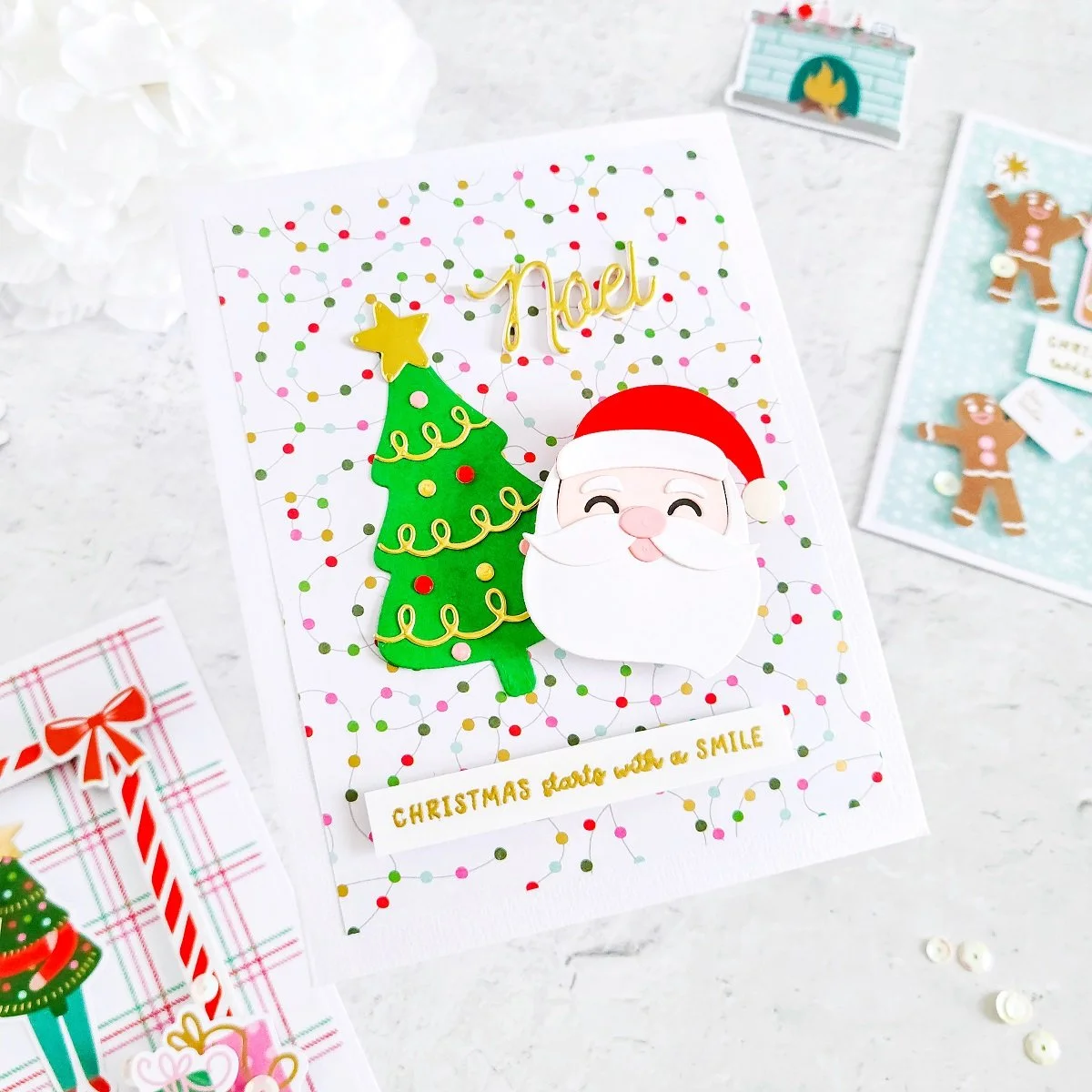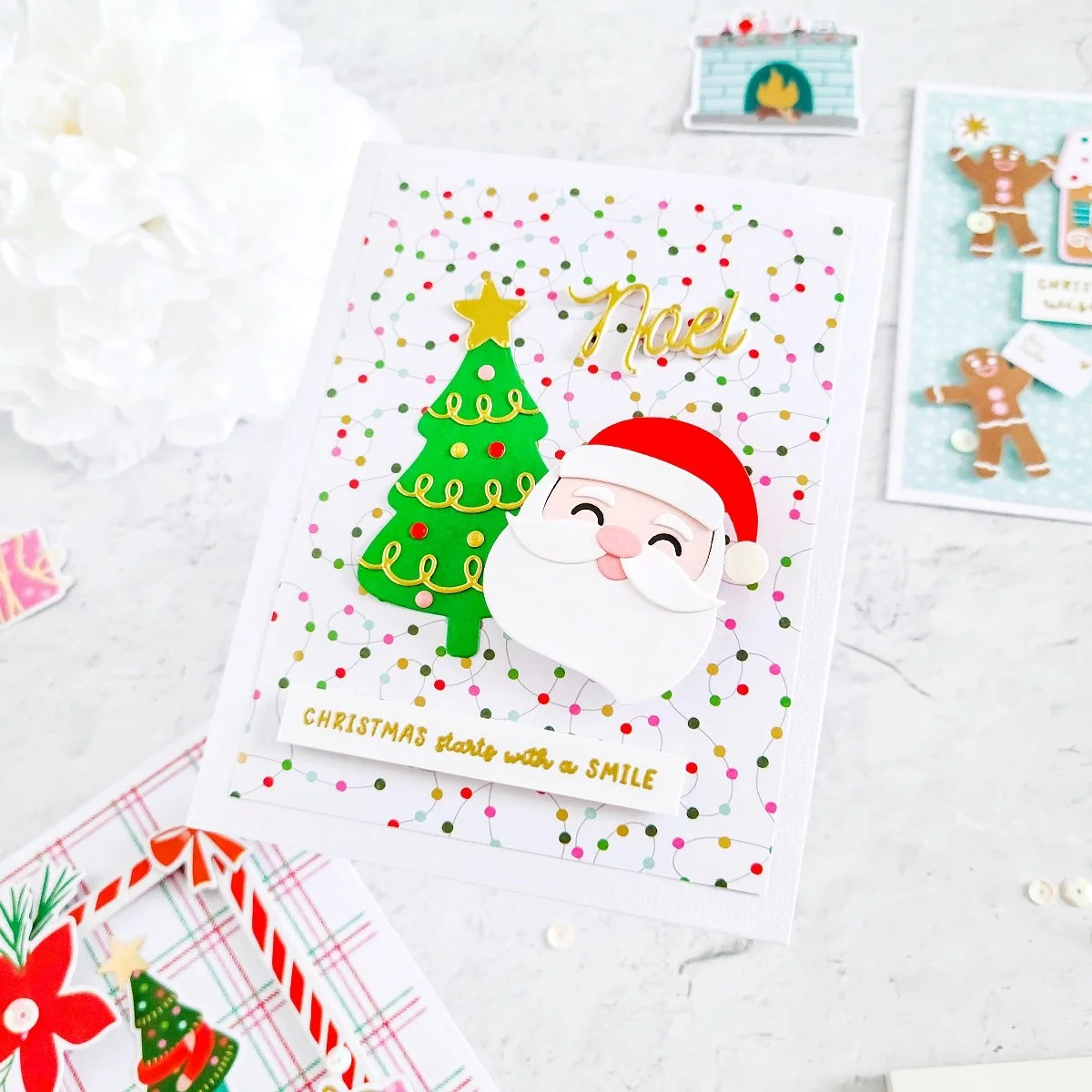 So, for the card assembling, I used one of the patterned paper sheets included in the paper pad; sheet which right afterwards I had gotten trim down smaller than the card base using my Paper Trimmer. Lastly, I went ahead to get the smaller panel adhered to one of the textured card base and then, I got the Christmas tree gluing down to the front card panel of the card while, I got the Santa mounted with a cardmaking paper spring not only to add dimension but a pop-up and fun effect as well. That being said, after getting the Santa mounted to the front card panel, I went ahead to finish the card off by adding the dimensional die-cutting Noel sentiment along with a sub-sentiment which, I had gotten previously stamp and heat embossing on a cardstock strip using one of the card sentiments included in the stamp set from the kit.