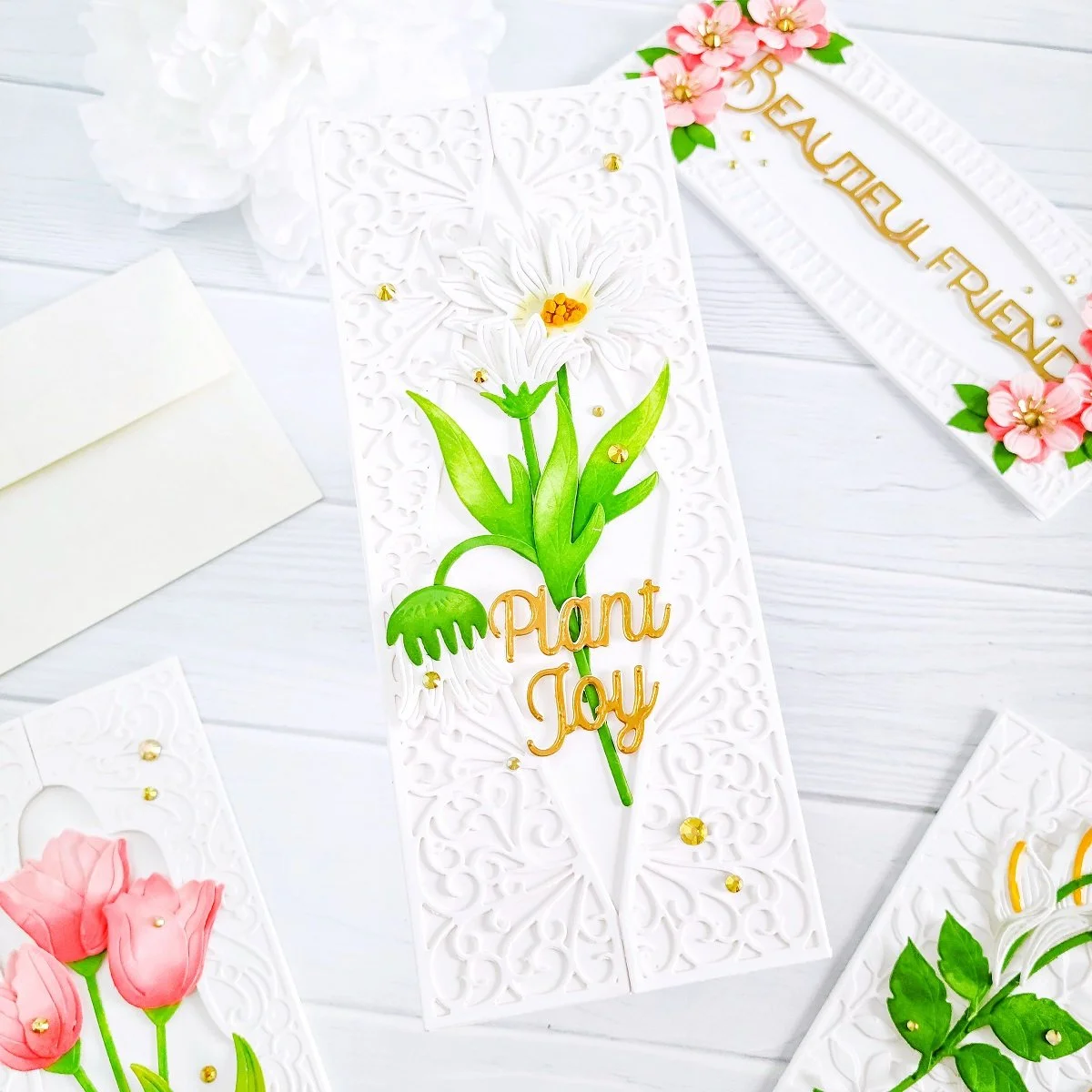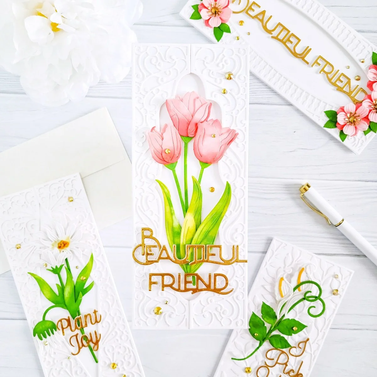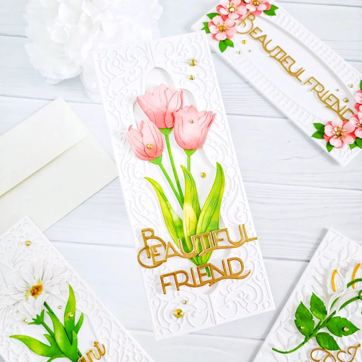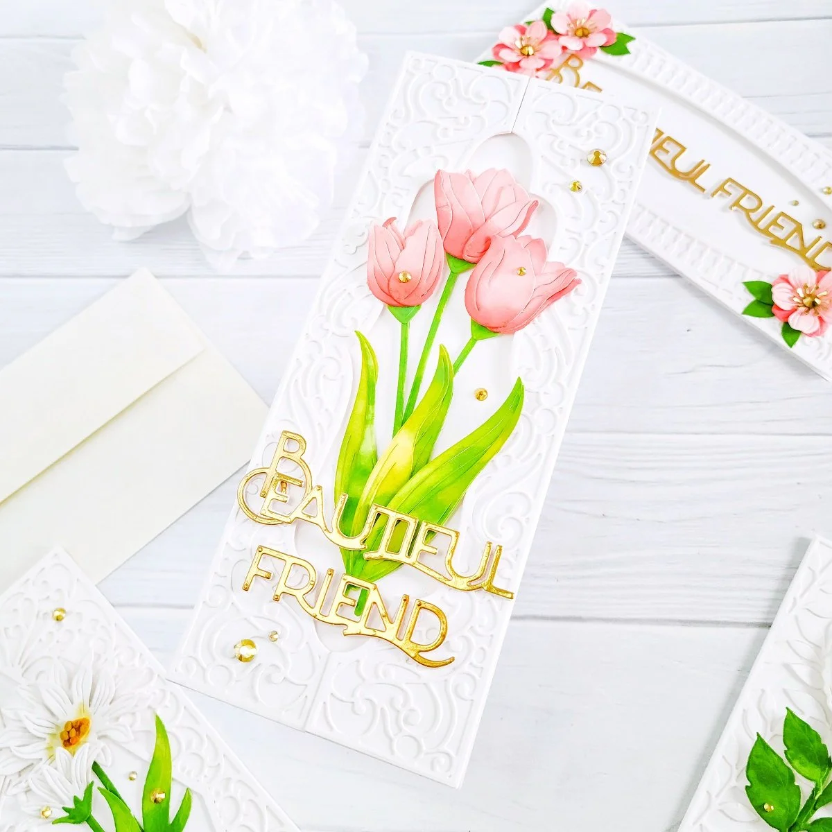 Lastly, for the last example, I created a portrait looking card as well but this time, I used Half Slimline Bracket Etched Dies to create the intricate and detailed slimline background for the card. And, I used Layered Tulips Etched Dies to add the floral look.