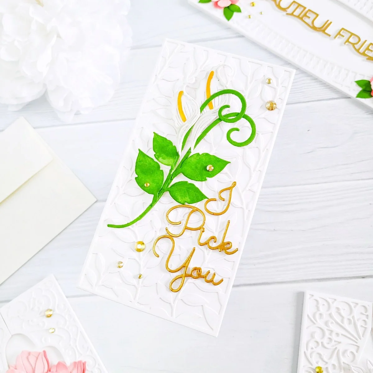 This collection includes a mini slimline set as well, so to make the second example, I went ahead to line up over a large piece of white cardstock the die included in Sweet Leaf Mini Slimline Etched Dies and then, I proceeded to run it through the die-cut machine. Once, I got that done, I went ahead to glue down the intricate leafy frame over a mini slimline card and then, I proceeded to use the dies included in Layered Lilies Etched Dies to cut out the floral cluster out of white cardstock.