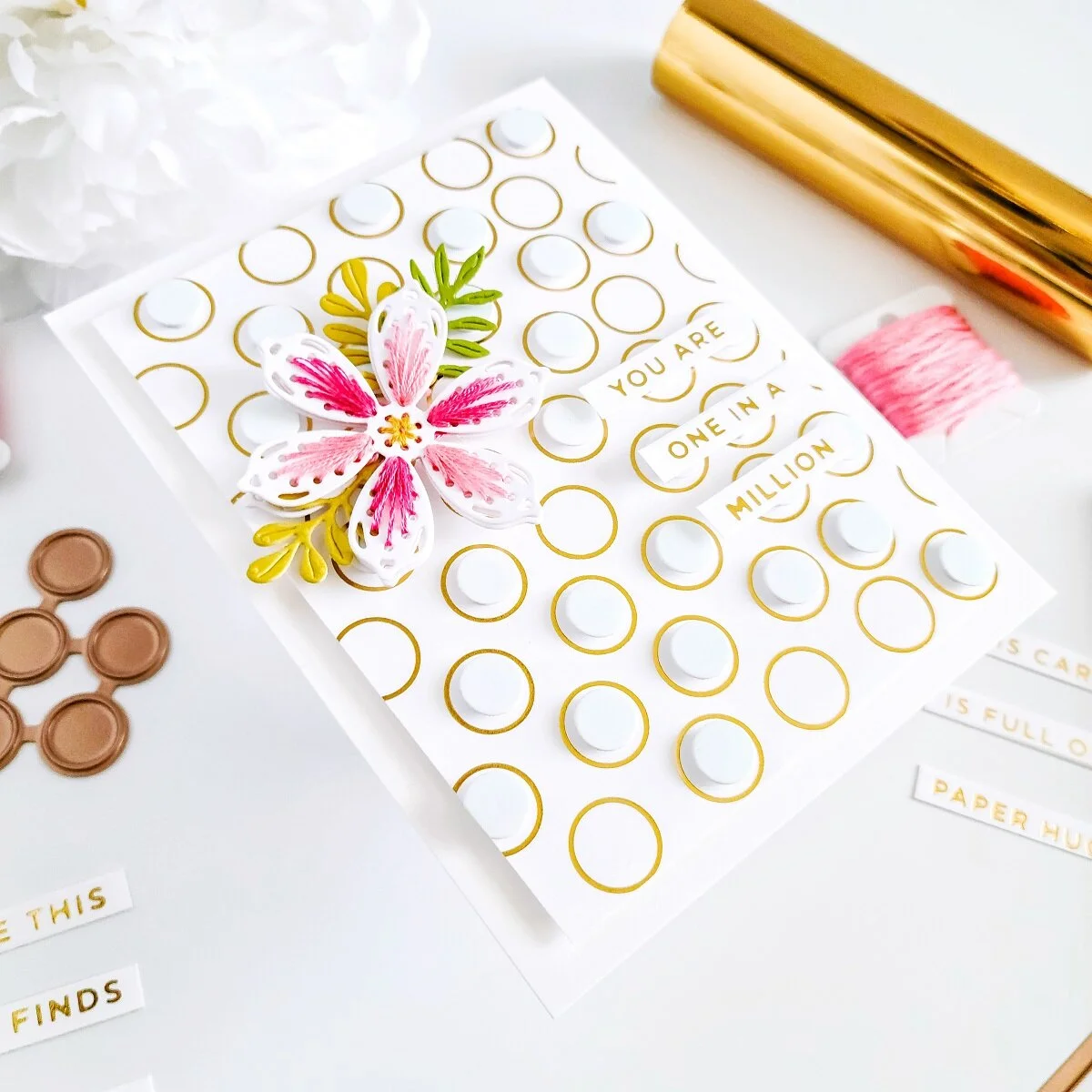 Lastly, I’ve gotten mounted with craft foam adhesive the 3 of the sentiments to create the sentiment for the card on the right side of the card and then, I finished the card off by embellishing it with a floral cluster which I created using a hand stitched flower along with some die-cutting greenery and mounted afterwards on the upper left side of the card. By the way, the stitching bloom die is including on this month’ s Large Die of the Month and the greenery is a combination of dies from Mini Blooms and Sprigs Etched Dies and Simply Perfect Layered Blooms Etched Dies.