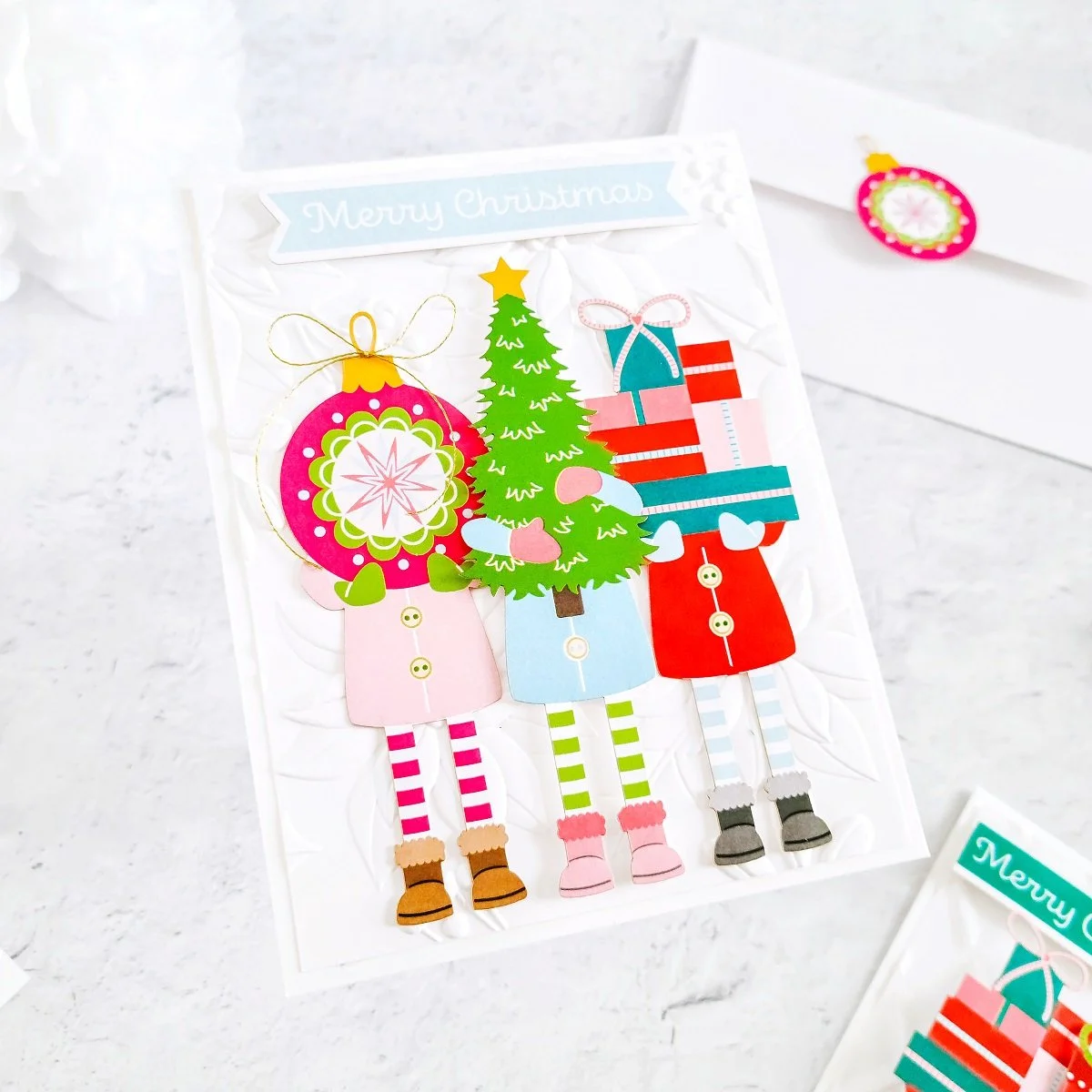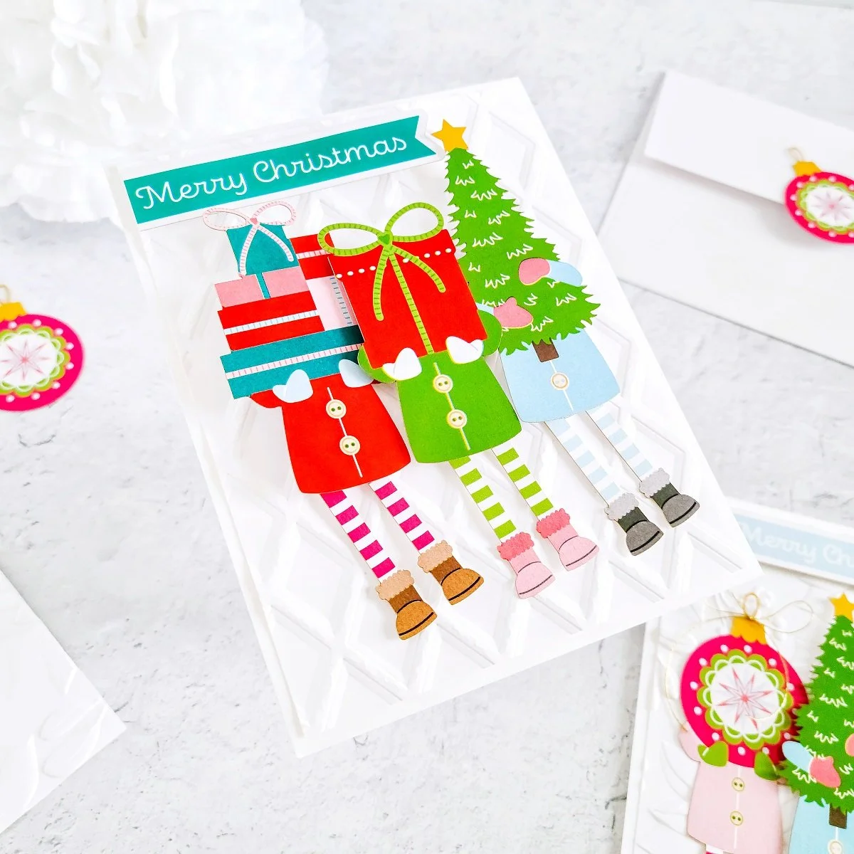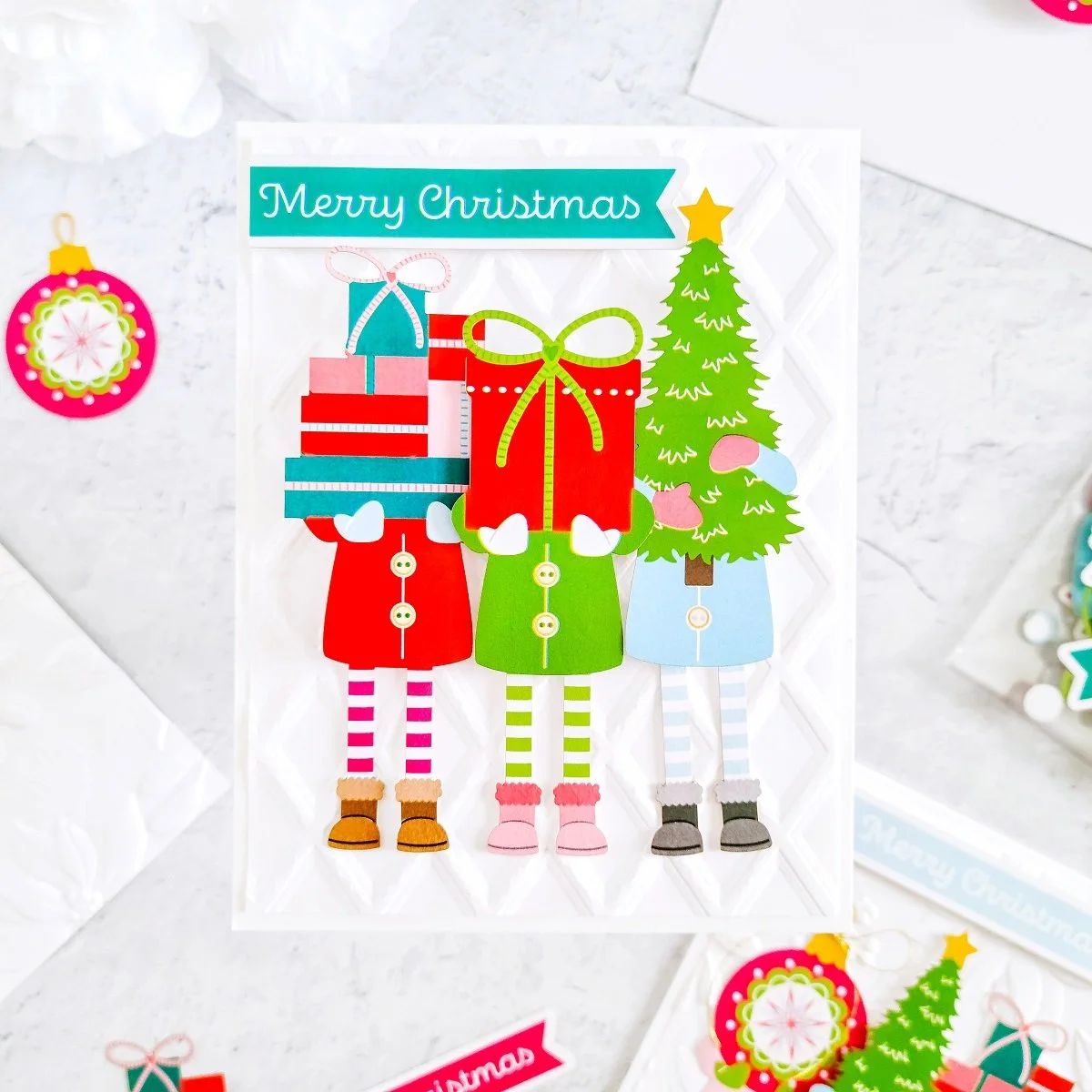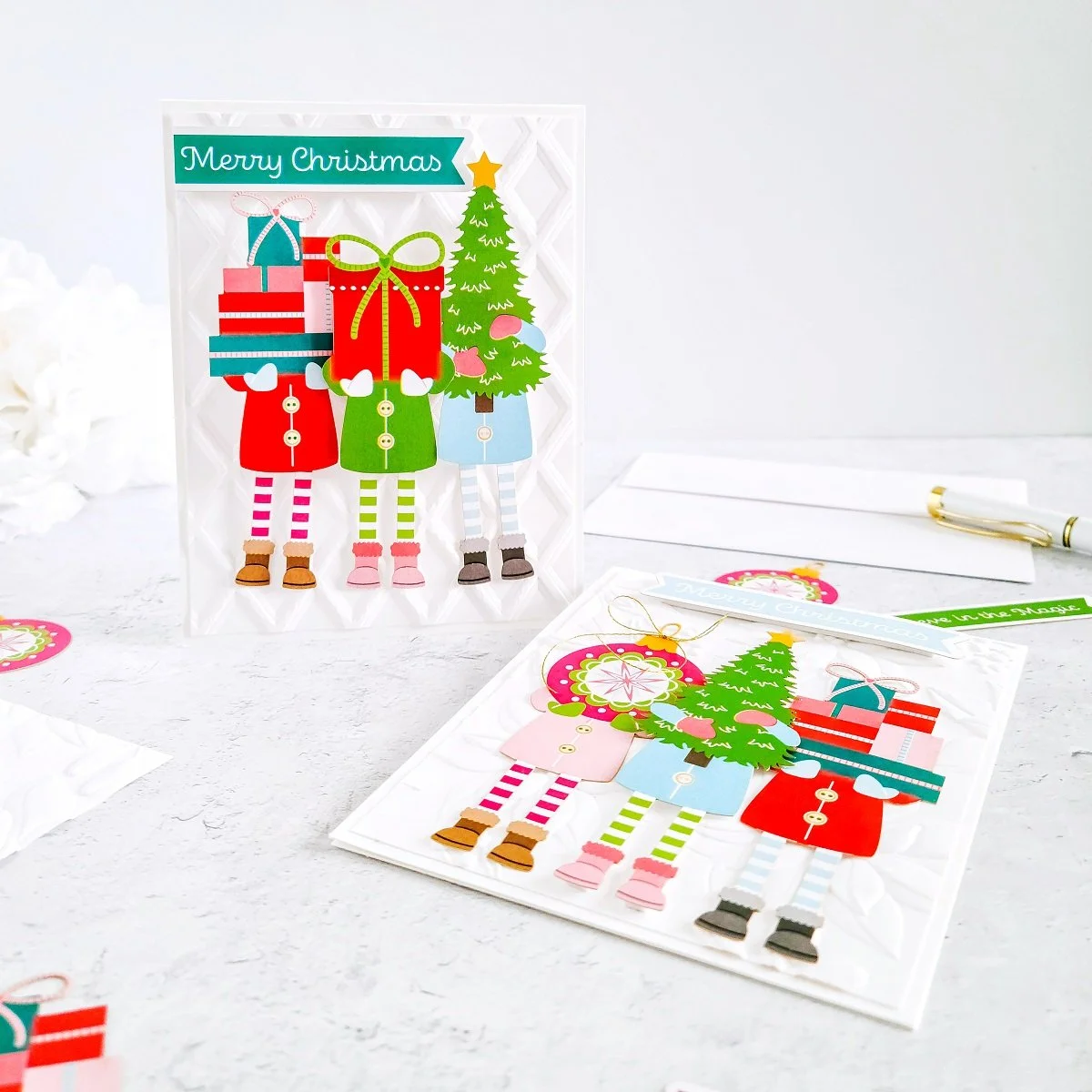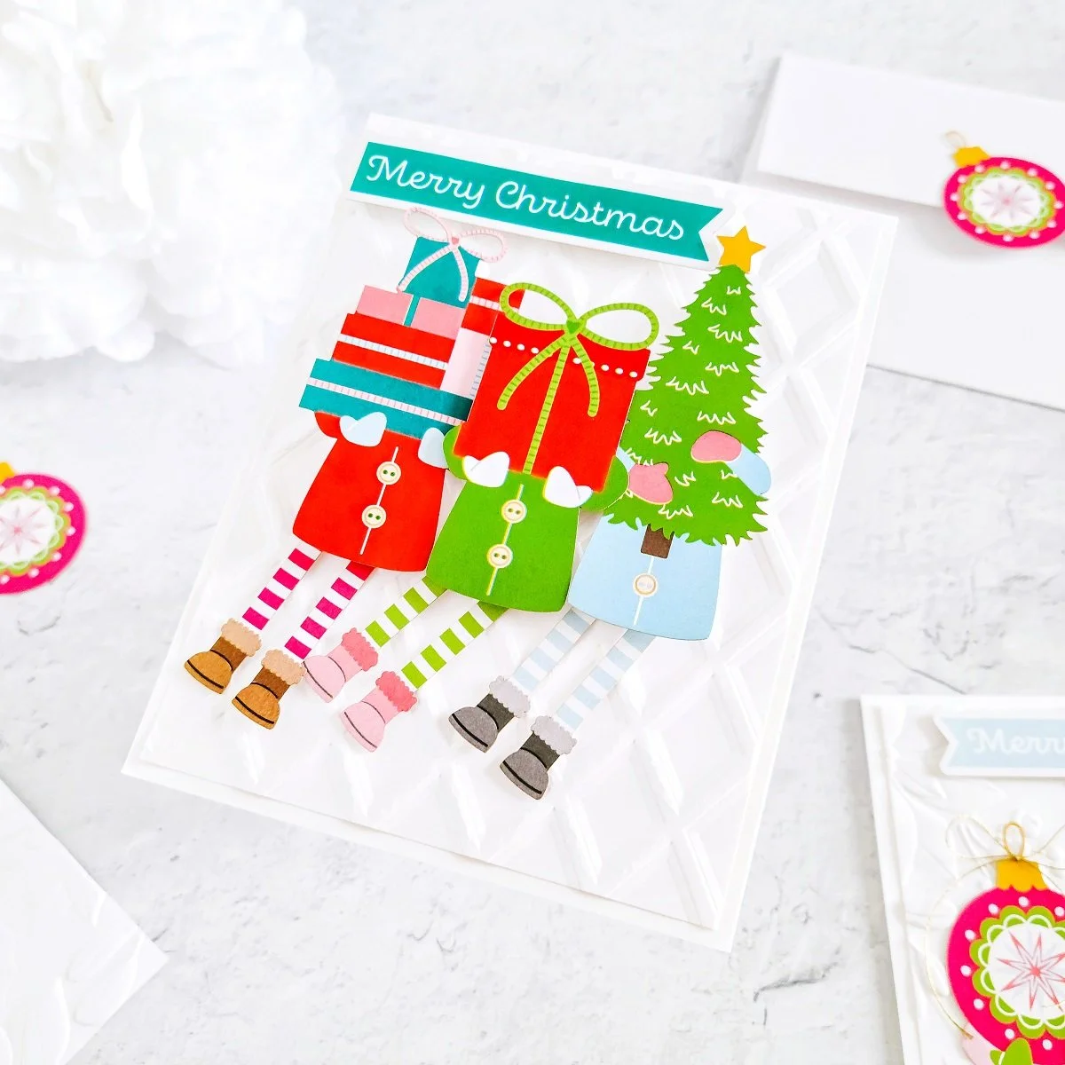 Moving on, for the second example, I added all the fun by selecting some of the die cut shapes that create movement on the gift giver legs. Therefore, I went ahead to add texture to another A2 size white card panel using Dimensional Diamonds 3D Embossing Folder. Next, I trimmed down 1/4 of an inch from each side and then, I got the backing of it adhered with double-sided adhesive to an A2 size top folding white card base.
