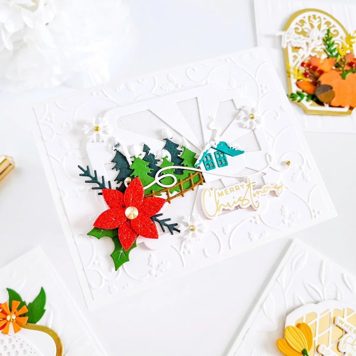 Thus, to keep a cohesive look for the card set, I went ahead to add texture to the white card background using Holly Flourish 2D Embossing Folder then, I got its edges trimming off and then, I got the backing of it adhered to the card base. Next, I went ahead to layer over the label and then, I got it mounted over the front card panel on a landscaping design. Lastly, I went ahead to put together the wintry scene and to add a little extra detail, I added True Snow Craft Supply to the tip of the pine trees and the house’s roof. Lastly, I added some die-cutting snowflakes and the card sentiment finishing off that way the last seasonal card. By the way, for the card sentiment, I used the same foil hue and one of the glimmer hot foil plates including in Yana's Christmas Sentiments Glimmer Hot Foil Plate & Die Set.