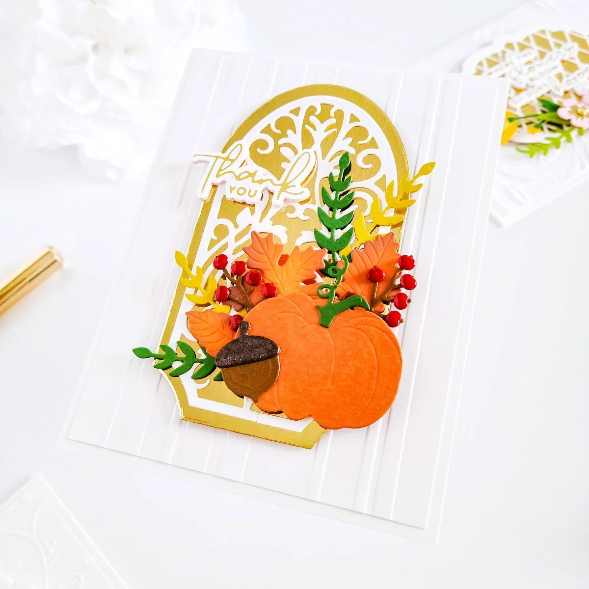 As, I moved forward with the Seasons, I proceeded to create a Fall looking card for the third example using the dies including in Fall Label Motifs Etched Dies. That being said, I also used Fall hues for each die-cutting piece.