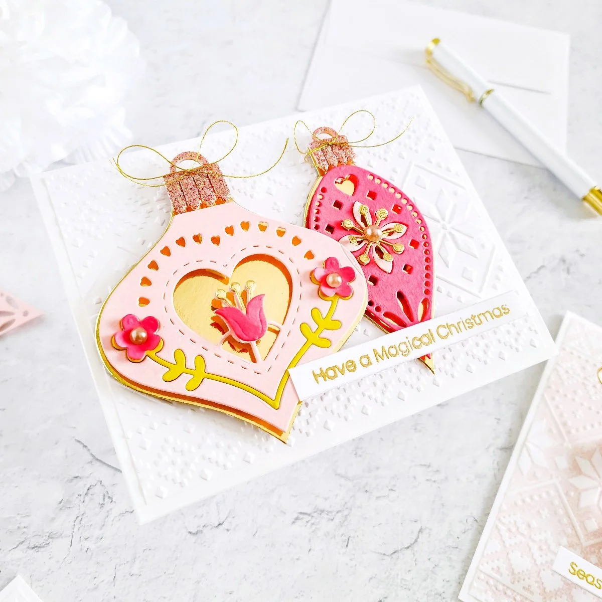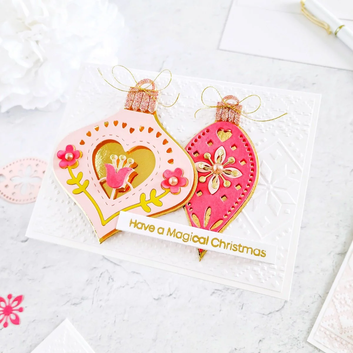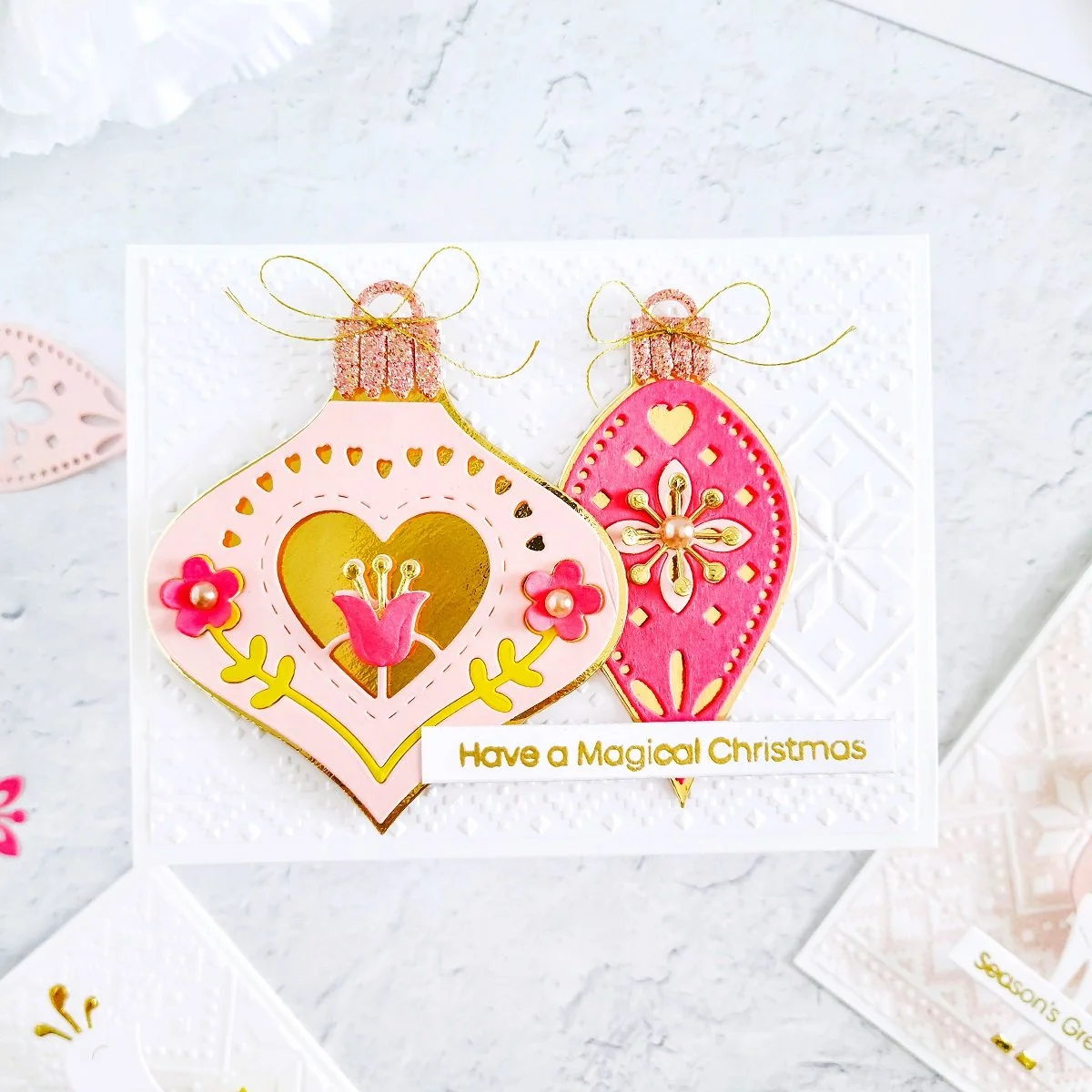 Then, for the second example, I used the dies included in Nordic Ornaments Etched Dies to cut out the solid pieces for the large and medium ornaments from gold cardstock and their inlay die-cutting images from the two different pink cardstock. Once, I had that done, I proceeded to layer over the inlay pieces to their bases using skinny pieces of craft foam adhesive to rise a little bit of dimension between both layers. Followed by that, I used the smaller dies included in the set to cut out the smaller die-cutting pieces and then, I got those pieces gluing down to the ornaments.