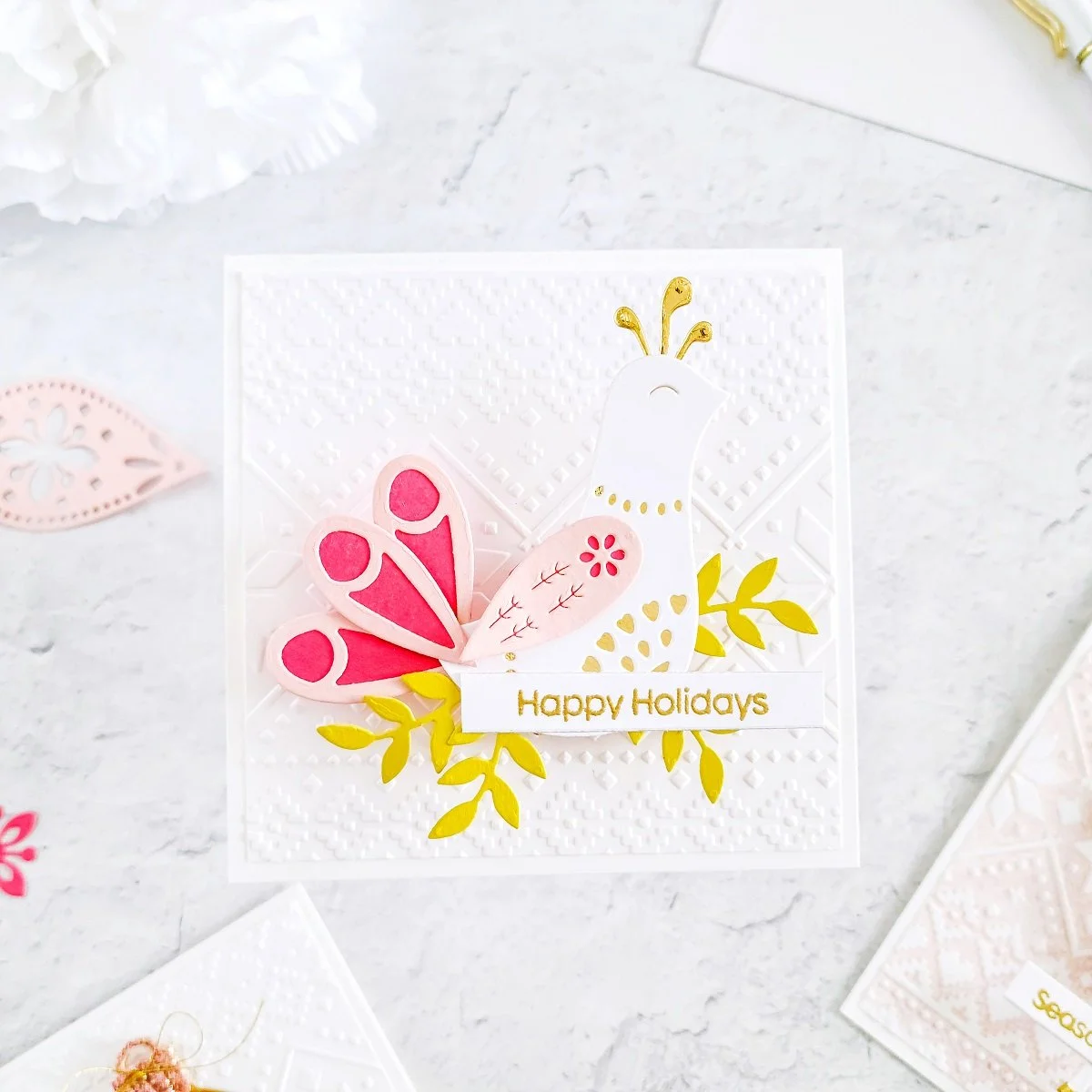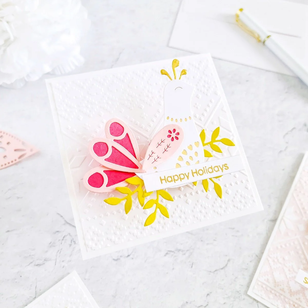 Therefore, for the first example, I made a 4-1/4 x 4-1/4 square card using Folk Song Etched Dies. Although this adorable bird design has lots of details on its body and wing on which, you can go creative inlaying different cardstock hues on the die-cutting details for a paper piecing look, I decided to go for a simpler look using my typical white and gold combo with two different pinks and a citrine green hue.