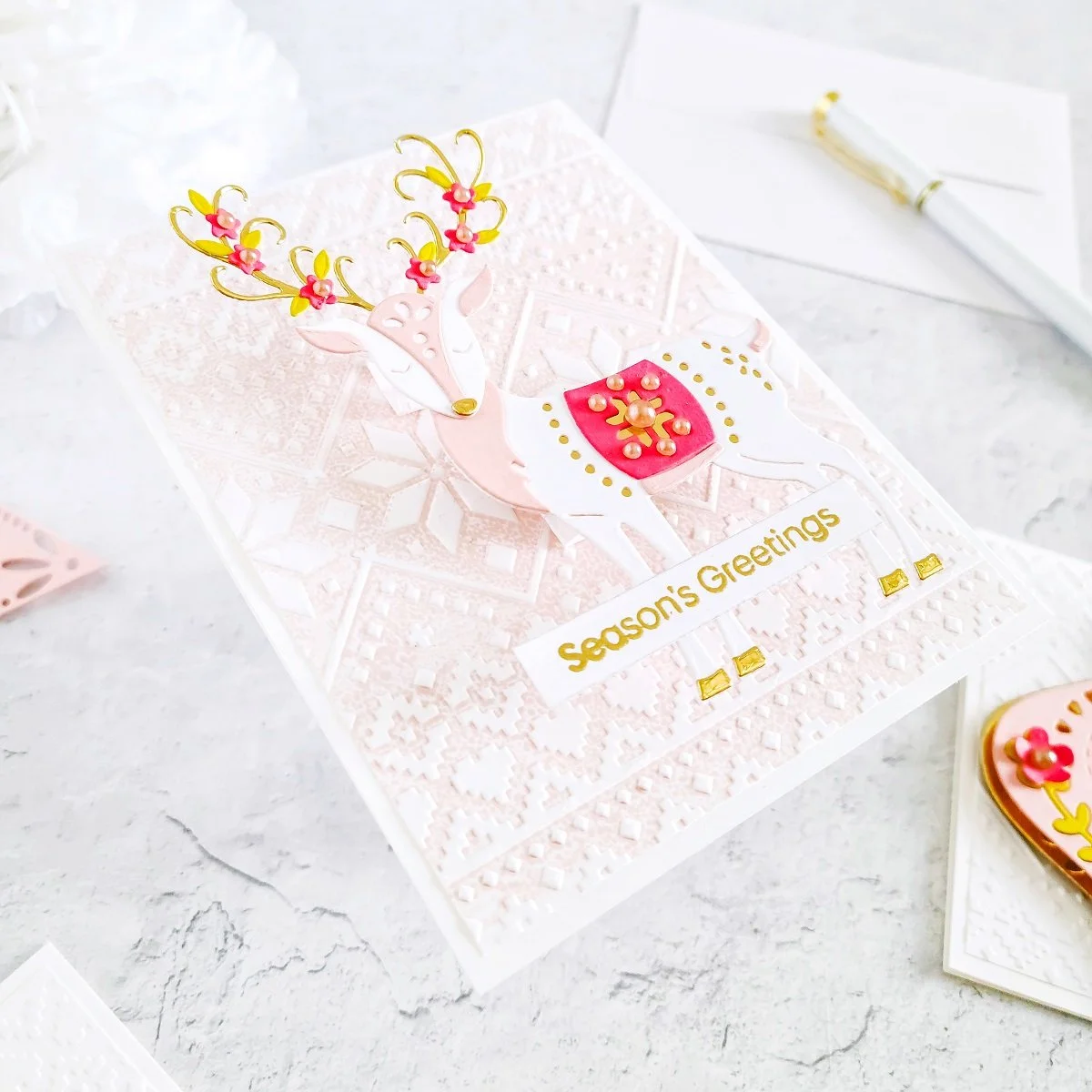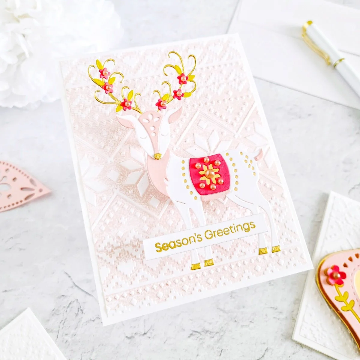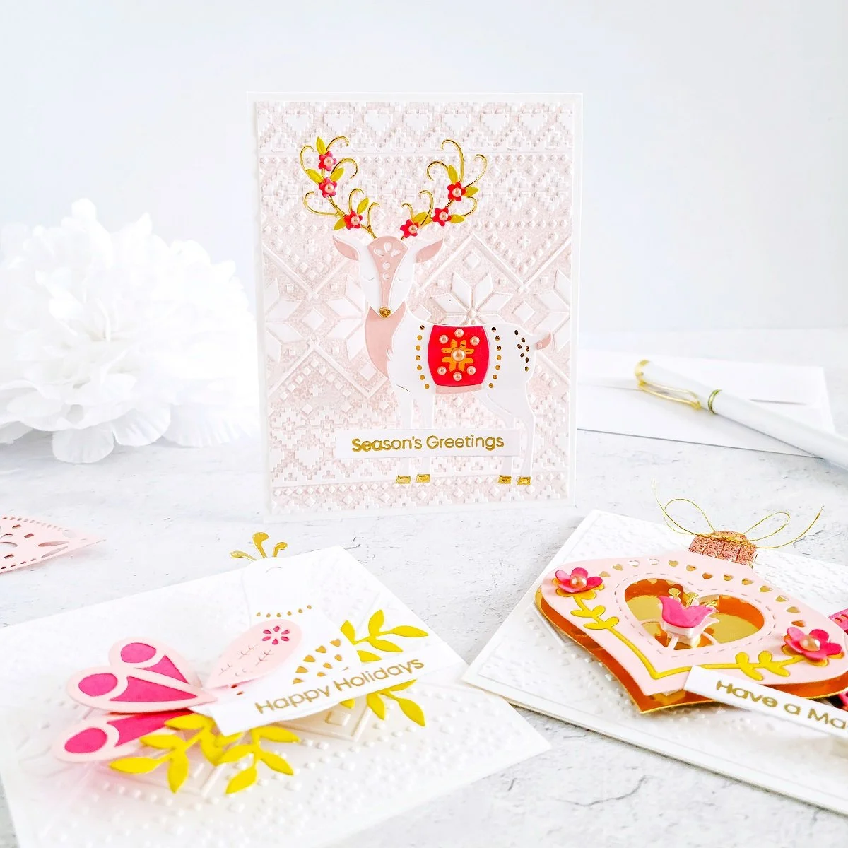 Happy Sunday, Friends! On today’s blog, I’d like to share with you a whimsical set of holiday inspiration cards made with a “Winter Scandinavian” look showcasing the latest; Winter Tales Collection by Zsoka Marko for Spellbinders. Which includes: Nordic Ornaments Etched Dies, Folk Song Etched Dies, Magical Deer Etched Dies, Peace & Joy Clear Stamp, Ski Lodge Embossing Folder, and Enchanted Garden Etched Dies. So, without further ado let’s jump right in to the step-by-step for how I made them ↓
