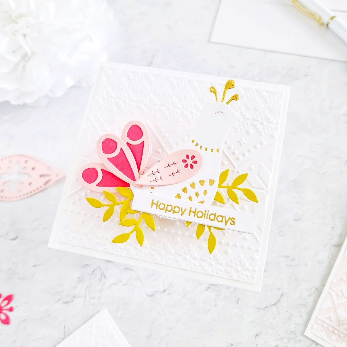 Moving on, I went ahead to get the bird assembled and then, I put it off aside. Meanwhile, I went ahead to use the die to cut out some sprigs and the die to cut out the bird’s head piece. Followed by that, I went ahead to add texture to a white card panel using Ski Lodge Embossing Folder. Then, after adding the texture to it, I proceeded to trim off the edges at 4x4 inches and then, I got the backing of the textured card panel adhered with double-side adhesive to a 4-1/4 x 4-1/4 white card base. Lastly, I got the bird assembled and mounted to the card base with dimensional pop-up pieces that I created from paper scraps, adding that way lots of dimension to it. And, to finish the card off, I went ahead to glue down the sprigs underneath the bird and the the card sentiment as well. As for the card sentiment, I used one of the sentiment stamp images included in Peace & Joy Clear Stamp.
