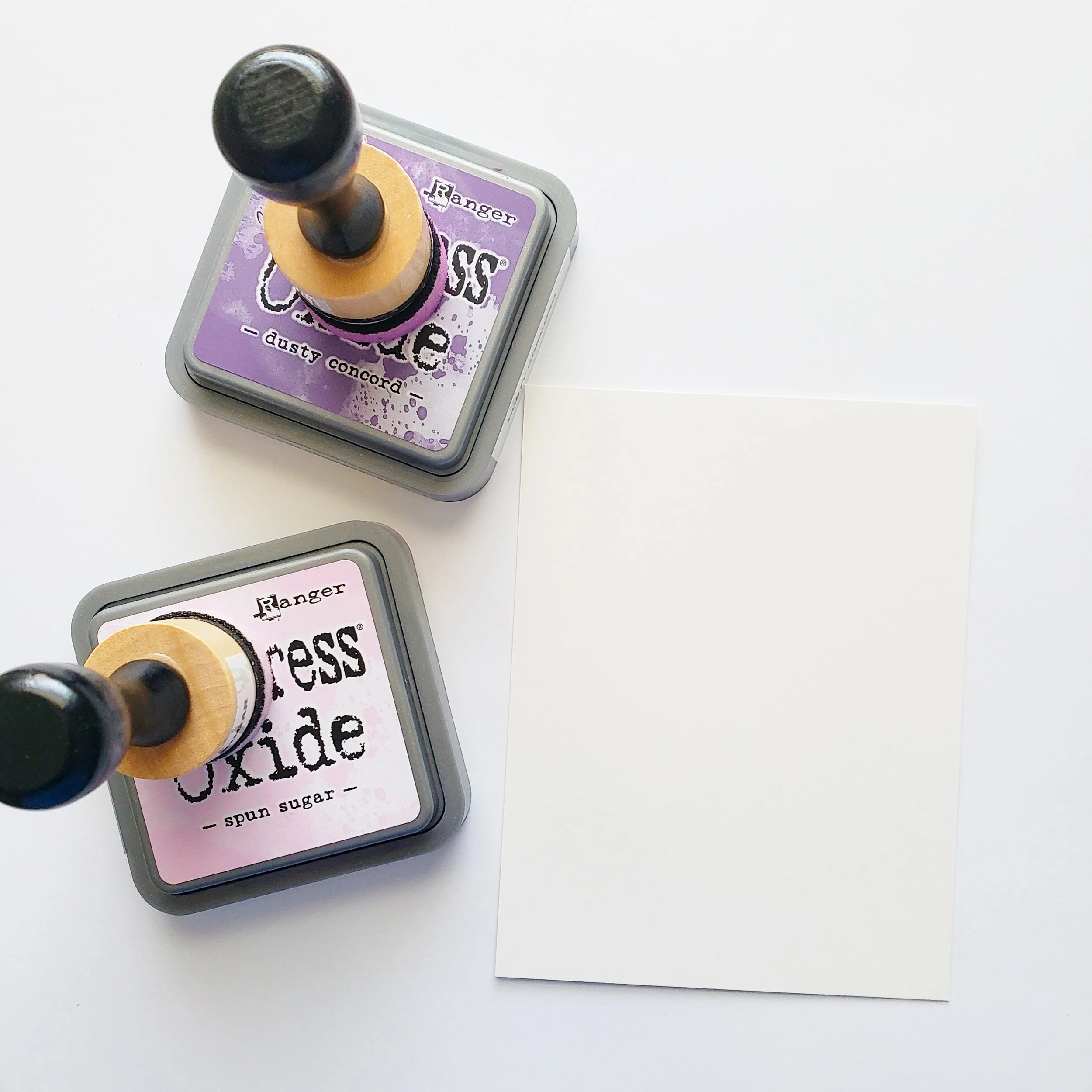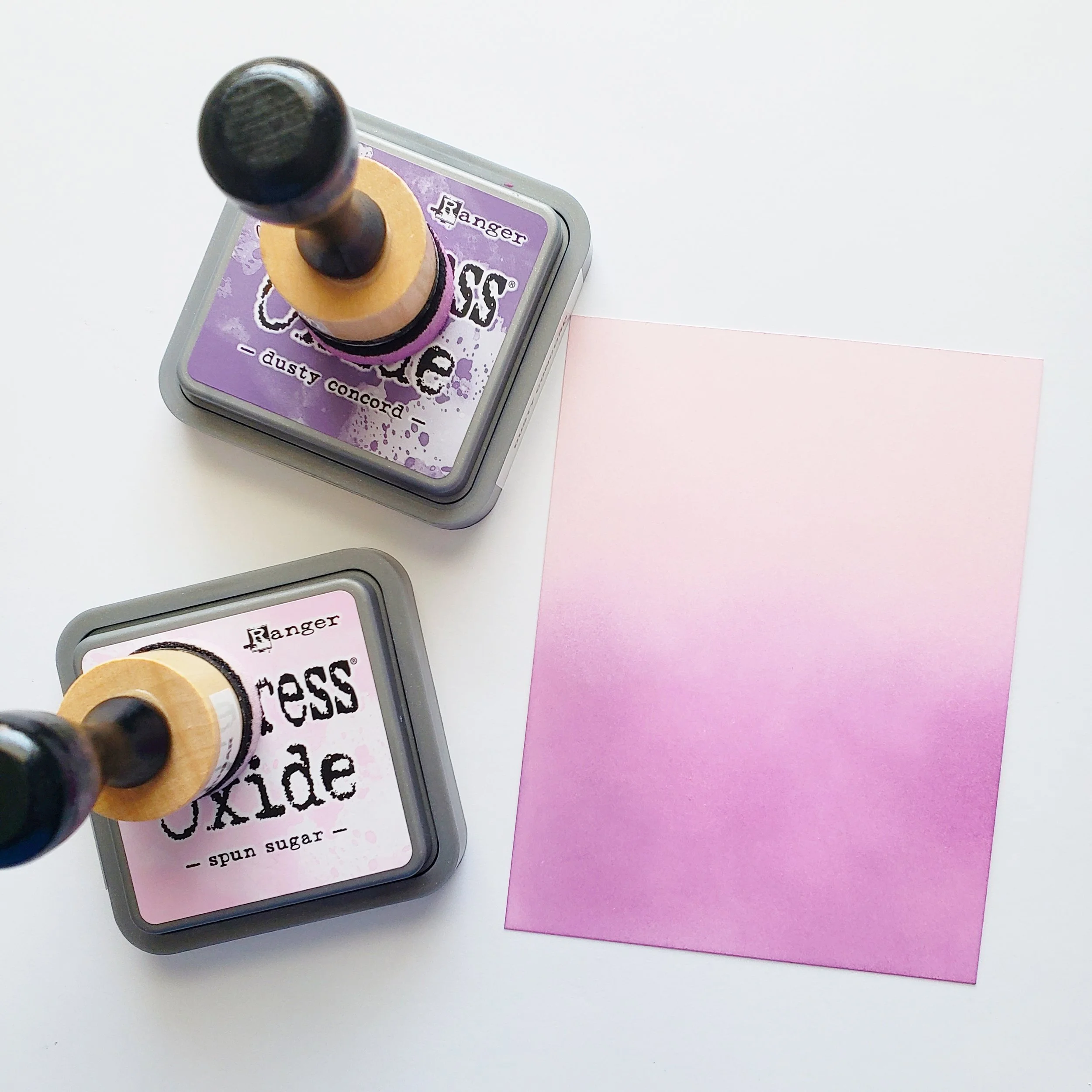 First, I started with the blending technique. Using, Spun Sugar and Dusty Concord Distress Oxides Inks by Ranger. I blended both colors in circular motion on top of a Bristol Smooth Surface panel. Until, I didn't see any harsh lines between both colors.