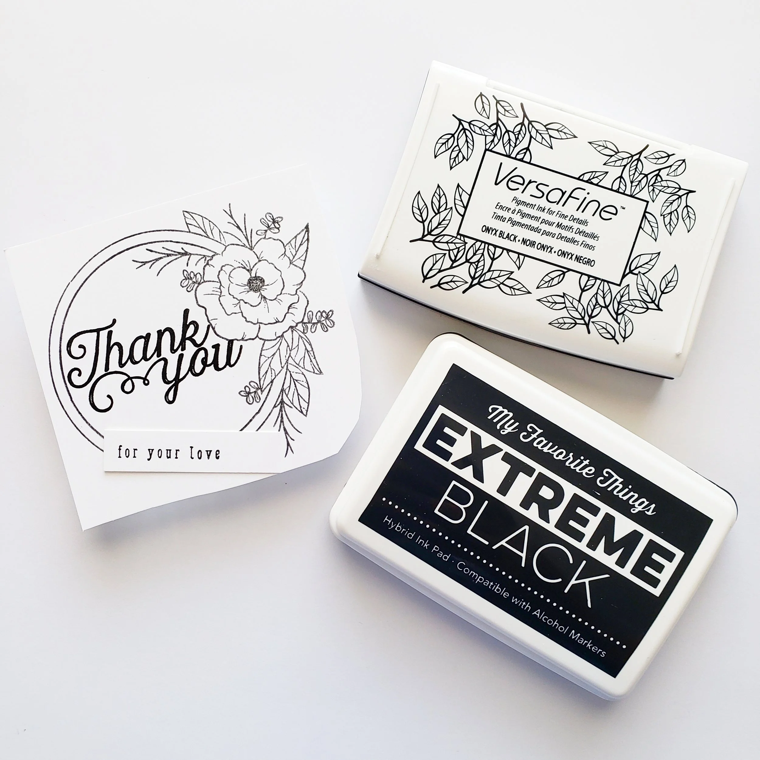 Second, While the blending was drying out. I stamped the Floral and the sentiment for the card, using Versafine Onyx Black for my sentiment and Extreme Black copic friendly ink on a piece of Neenah Solar White #80 Classic Crest cardstock.