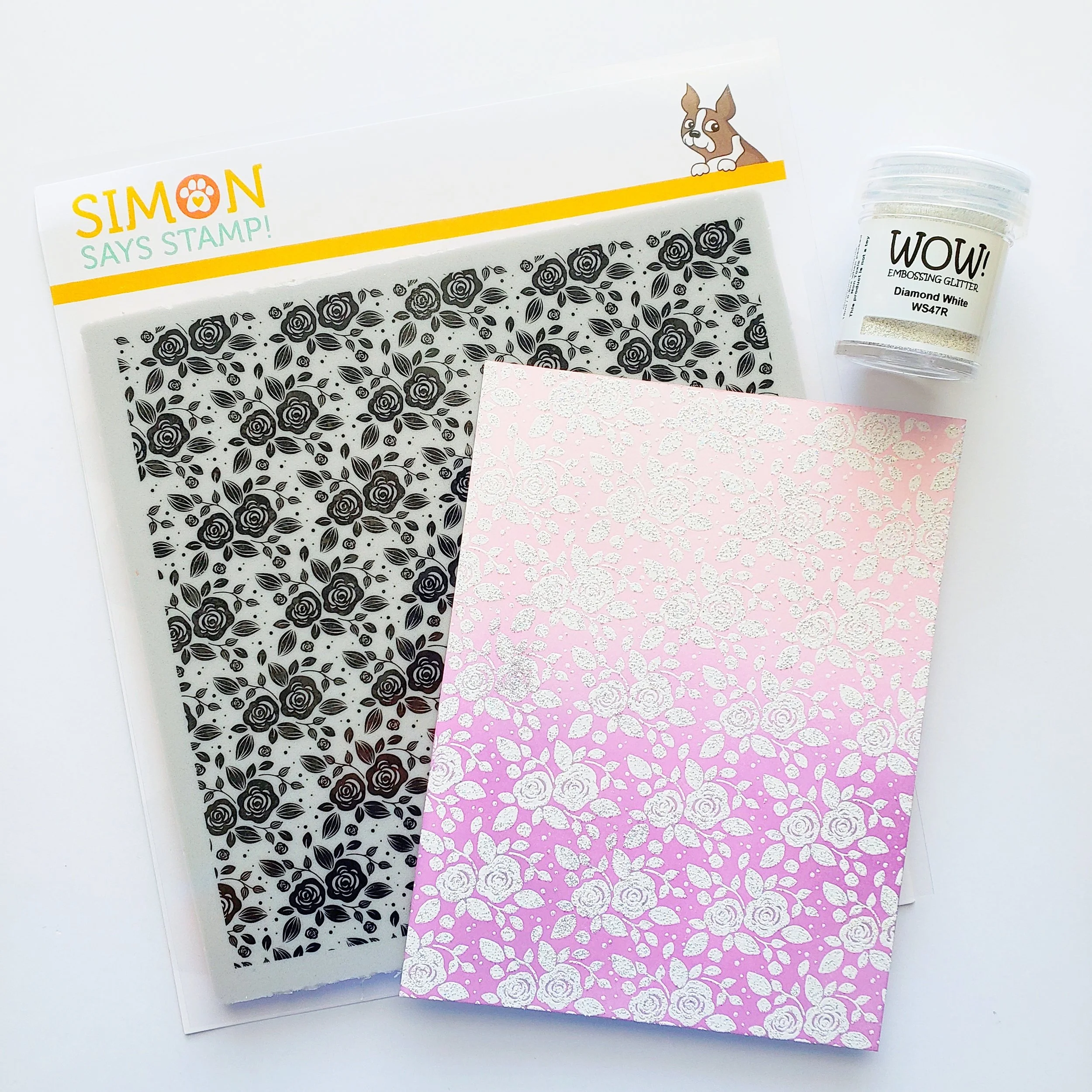 For my stamping, I am featuring once again the Mandy's Flowers stamp set by Simon Says Stamp. Also, I'm using the cling rubber stamp Modern Rose Blooms Background included in this kit for the card panel.
