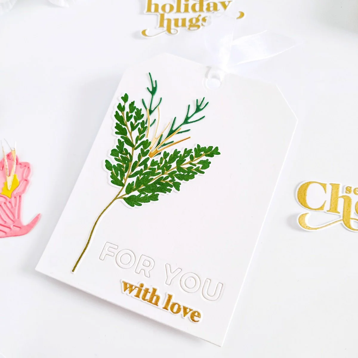 Then, to get the inner pocket fill out, I created a die-cutting tag which could also be used to write a handwritten message. So, to make the die-cutting tag I used Jumbo Tag Die along with a piece of translucent ribbon and some of the left-over stamped and die cut images.