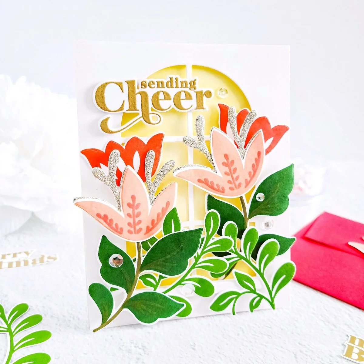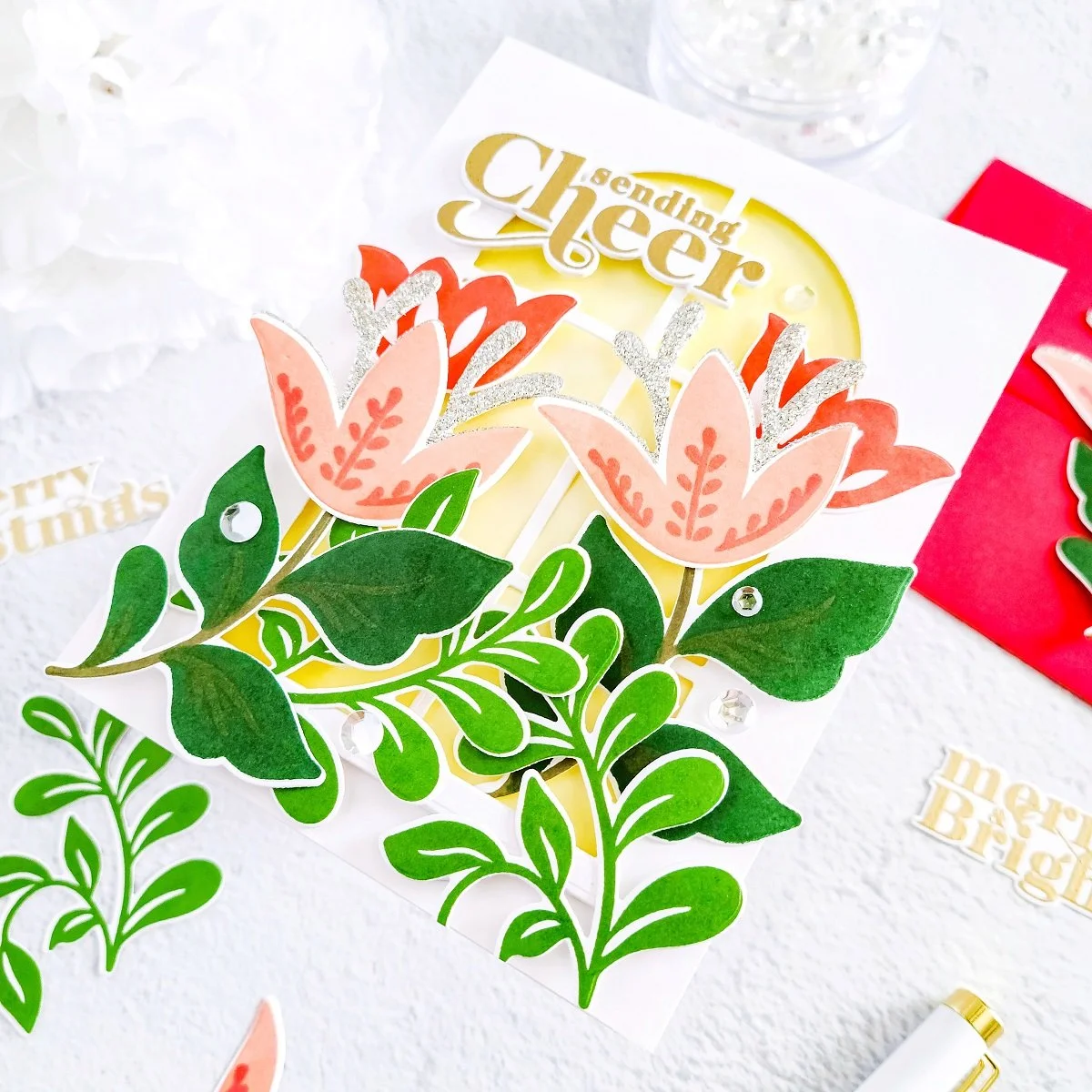 Moving on, once that I’ve had gotten the flowers and leaves mounted over the front card panel, I went ahead to mount card sentiment over the upper left side of the die-cutting window as well, a card sentiment which I had get stamped and die cut out of white cardstock using a sentiment from Sending Cheer Stamp Set along with its coordinating die which is including in Sending Cheer Dies Then, last but certainly not least, I went ahead to finish the card off by gluing down here and there some of the Crystal Confetti to add even more shine to the card.