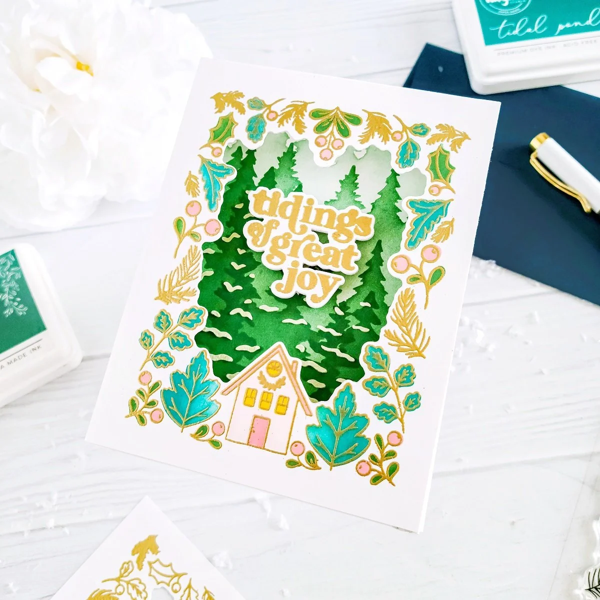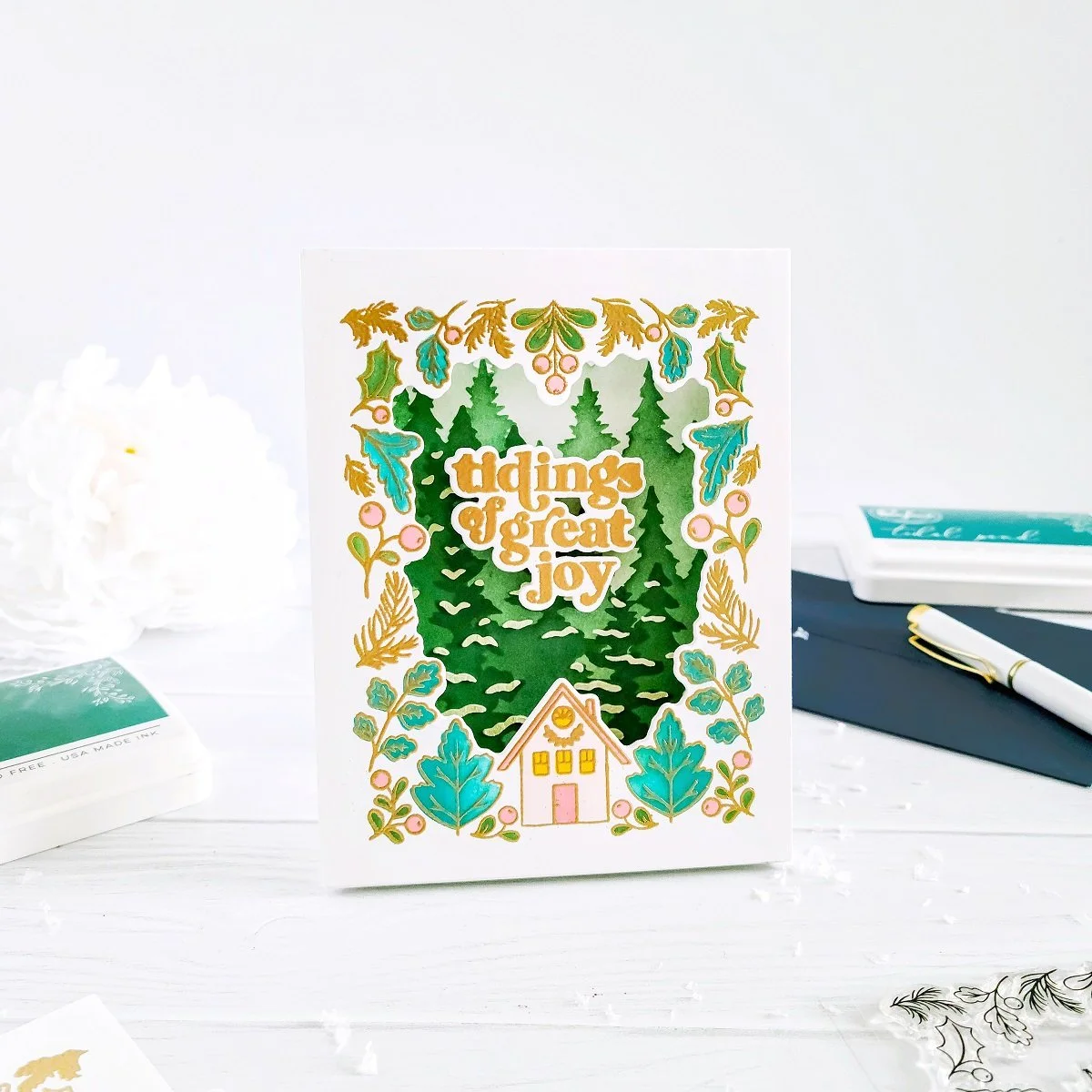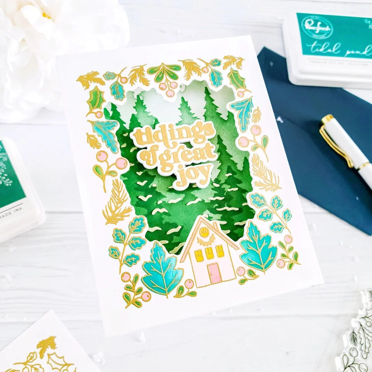 Happy Monday, Friends! On today’s blog, I will be sharing with you another holiday inspiration card made with a “Pop-Up Twist” look using: Tidings of Great Joy Stamp, Tidings of Great Joy Stencil and Tidings of Great Joy Die to create the frame and front card opening plus, Wintry Forest Stencils to add the wintry background. And lastly, PFS- Inks to add the pops of colors to the card. So, without further ado let’s jump right into the step-by-step for how I made it ↓