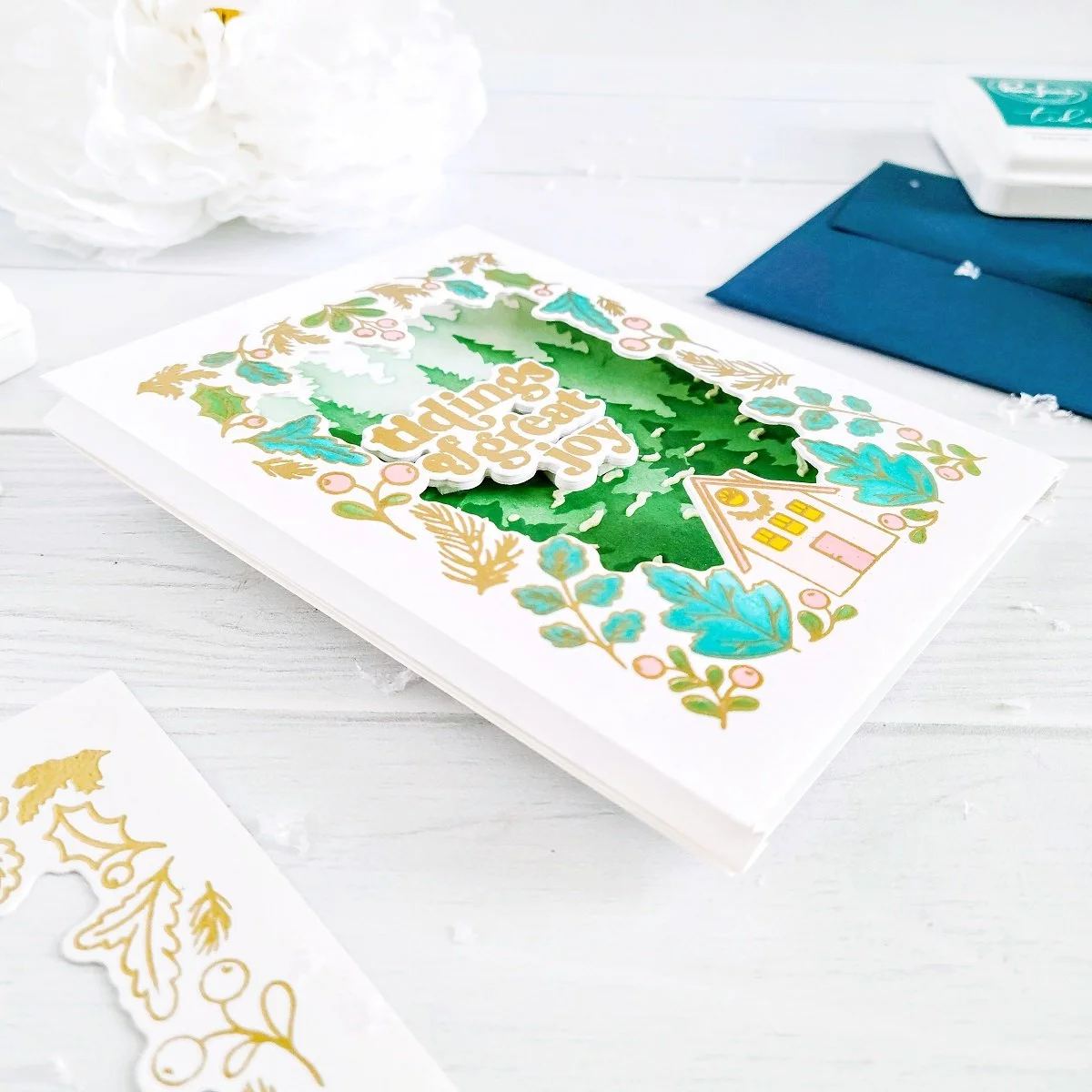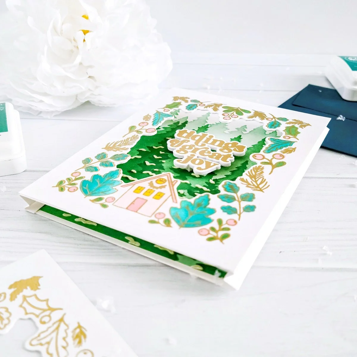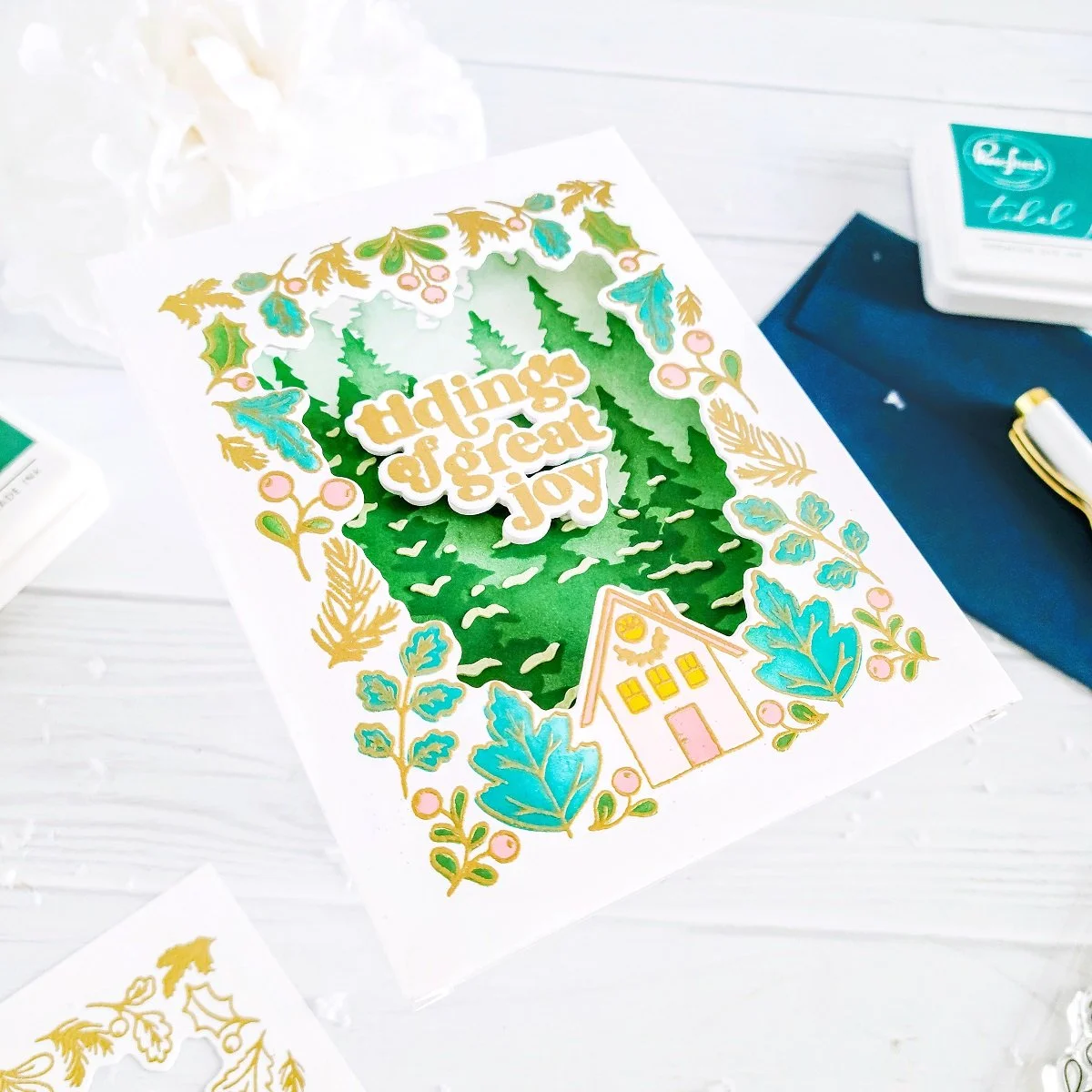 Happy Monday, Friends! On today’s blog, I will be sharing with you another holiday inspiration card made with a “Pop-Up Twist” look using: Tidings of Great Joy Stamp, Tidings of Great Joy Stencil and Tidings of Great Joy Die to create the frame and front card opening plus, Wintry Forest Stencils to add the wintry background. And lastly, PFS- Inks to add the pops of colors to the card. So, without further ado let’s jump right into the step-by-step for how I made it ↓