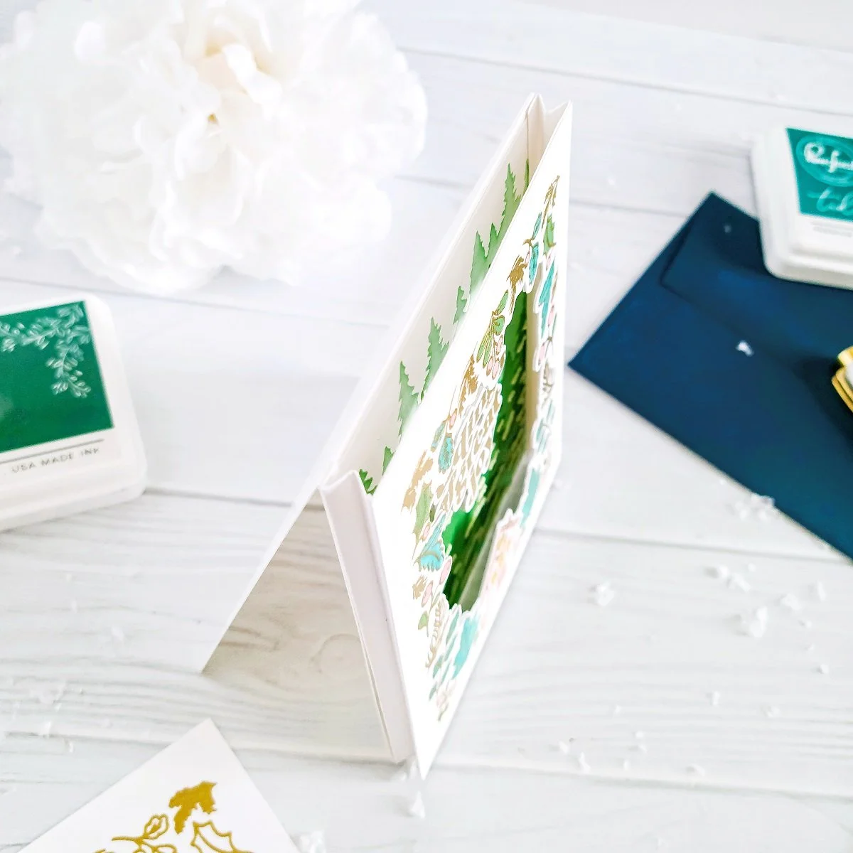 So, for the layered stenciling for the card background, I went ahead to use an ink blending brush along with the stencils included in Wintry Forest Stencils. That being said, to keep it simple, I used only Evergreen Ink to create the wintry gradient look. However, to add an extra glittery texture to it, I used the last stencil along with one of the Tonic Studios Nuvo Media Spatulas and Glitter Snow. Thereupon, after I had finished creating the wintry background over the card panel, I proceeded to trim off 1/4 of an inch from each side using my Paper Trimmer and then, after that, I got its backing adhered with double-sided adhesive to an A2 size top folding white card base.