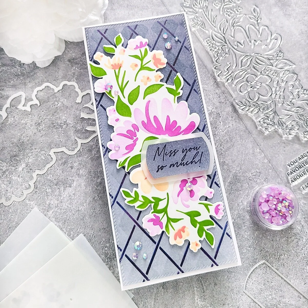 Happy Tuesday, friends! Today, I’m up on Pinkfresh Studio Blog sharing this “No-Line” slimline-Floral card made using You Are My Favorite Coordinating Die Set and You Are My Favorite Coordinating Stencil Set. Along with this beautiful set, I’m also using Argyle Layering Stencil Set, Slim Diagonal Stitched Rectangles Die Set, Essentials: Basic Label Frames Die Set, Floral Notes Stamp Set and of course PFS- Inks. Below, you’ll find some images for the card along with the full supply list. So, without further ado → CLICK HERE for the step-by-step for how I made it.