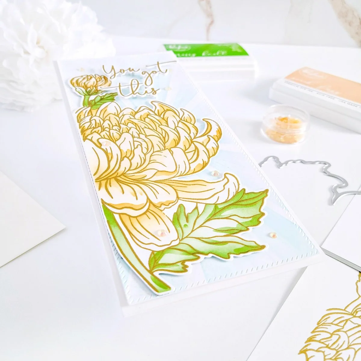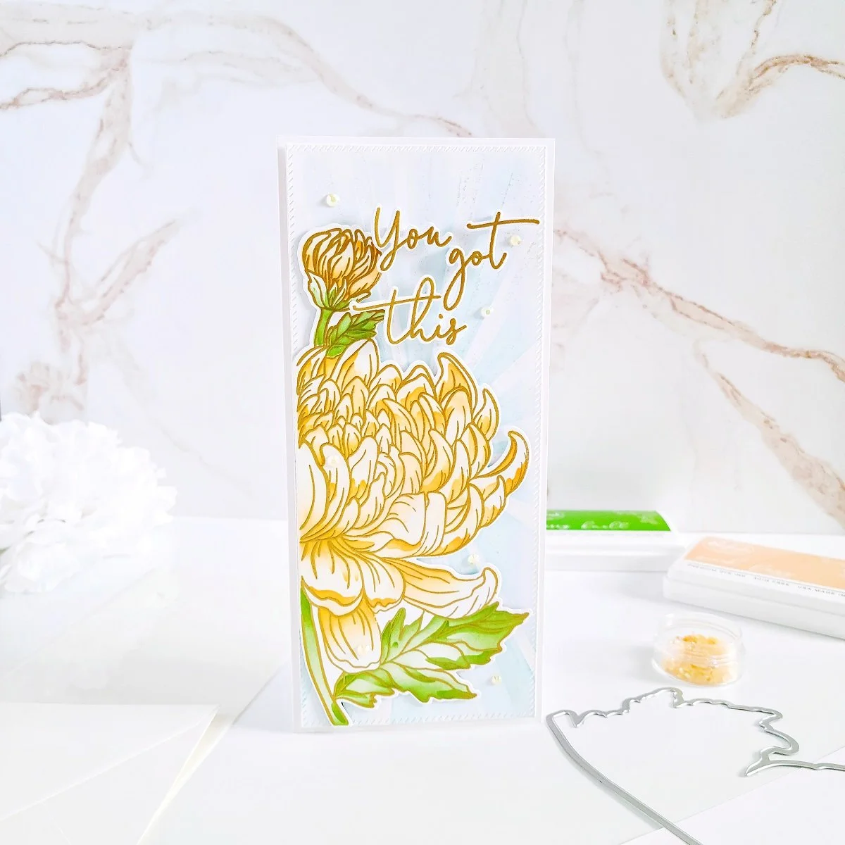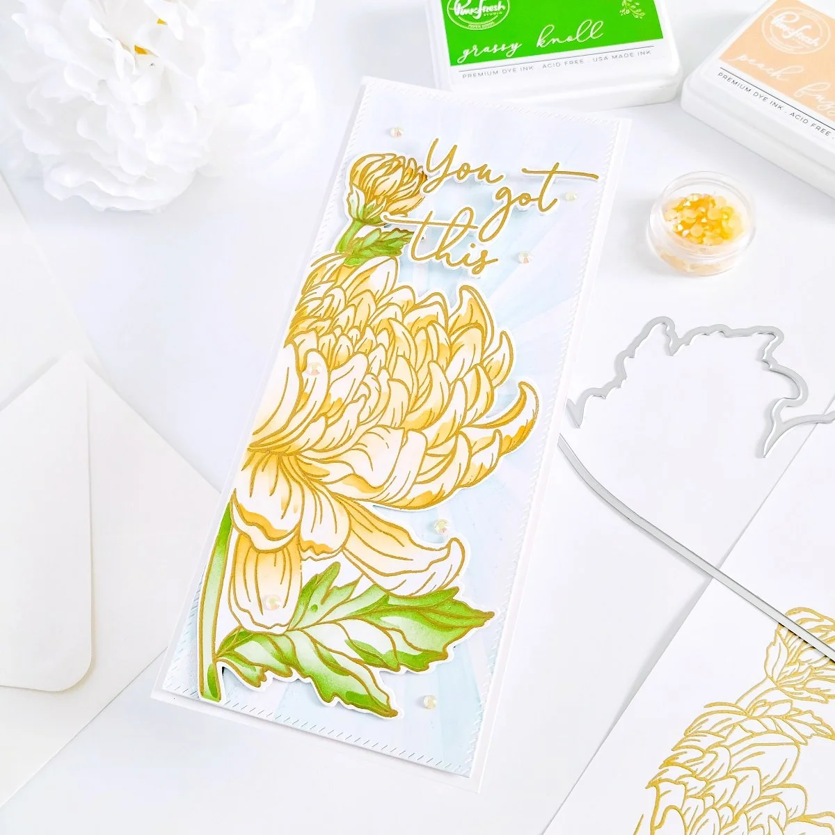 Happy Friday, Friends! On today’s blog, I’d like to share with you an “Encouragement” and very subtle slimline inspiration card with touches of glitter using: Chrysanthemum Slimline Stamp, Chrysanthemum Slimline Layering Stencils and Chrysanthemum Slimline Die from the latest February-2022 Stamp, Dies, Stencil & Hot Foil Release. by Pinkfresh Studio. Along with this set, I’ve used Slim Diagonal Stitched Rectangles Die Set to add the stitched details to the front card panel, and Slimline Layered Starburst Layering Stencil Set to add the subtle starburst effect to it as well. And lastly, PFS- Inks to add the pop of colors to the floral and card background. So, without further ado let’s jump right into the step-by-step for how I made it ↓